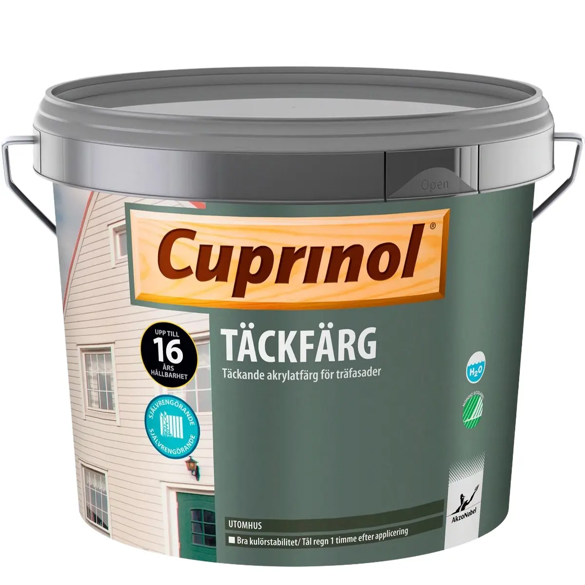 Cuprinols mest hållbara produkt med självrengörande egenskaper. Cuprinol Täckfärg är en halvmatt täckande färg avsedd för målning av träfasader. Färgen är av mycket hög kvalitet och håller upp till 16 år och har genom ett unikt bindemedel självrengörande egenskaper. Cuprinol Täckfärg har en konsistens som gör att den är lätt att applicera och kan påfäras i tjocka skikt. Detta tillsammans med den goda utflytningen ger en hög täckande förmåga. Cuprinol Täckfärg torkar så snabbt att du inte behöver oroa dig för en eventuell regnskur en timme efter applicering. Färgen är dessutom övermålningsbar efter två timmar, vilket gör att du snabbt kan färdigställa ditt projekt. När man målar med nya Cuprinol Täckfärg så får man en yta som är slät och extra hård vilket innebär att minimalt med smuts fastnar och ytan spolas ren vid regn. Detta i sin tur ger en minskad grogrund för alger och mögel som är ett stort problem.