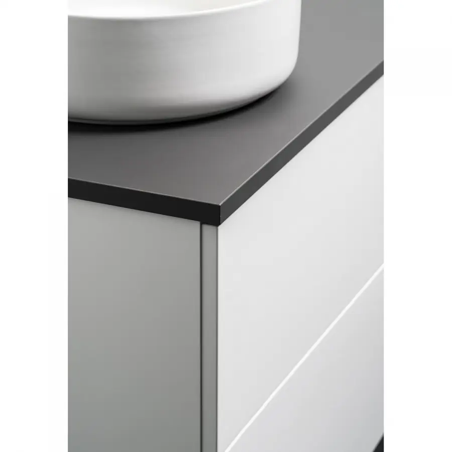 OnTop fukttröga bänkskivor av laminat. Antracit har en extra matt yta som motverkar fingeravtryck. Håltagning utförs av installatören beroende på blandare, handfatsmodell och och val av placering.