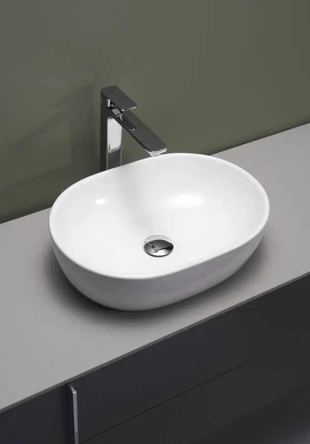 Ovalt fristående handfat i porslin utan bräddavlopp. Kombineras med hög blandare som monteras på bänkskivan.