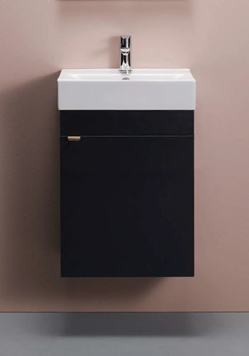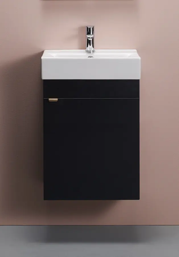 Tvättställsskåp i sammetsmatt lack i svart eller vitt med mjukstängande lucka som ger generös förvaring inklusive nedsänkt handfat. Tvättställsskåpet är enkelt att installera för en person med skena på vägg. Förberett för både vägg- och golvavlopp i bakkant för enkel montering. Justerbara upphängningsbeslag. Komplettera med det vattenlås som passar din lösning av badrumsskåp. Sätt din personliga stil med ett av våra handtag eller knoppar.