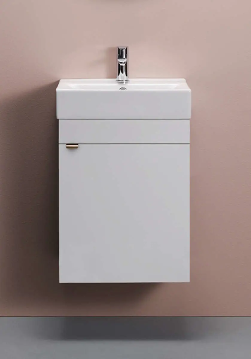 Tvättställsskåp i sammetsmatt lack i svart eller vitt med mjukstängande lucka som ger generös förvaring inklusive nedsänkt handfat. Tvättställsskåpet är enkelt att installera för en person med skena på vägg. Förberett för både vägg- och golvavlopp i bakkant för enkel montering. Justerbara upphängningsbeslag. Komplettera med det vattenlås som passar din lösning av badrumsskåp. Sätt din personliga stil med ett av våra handtag eller knoppar.