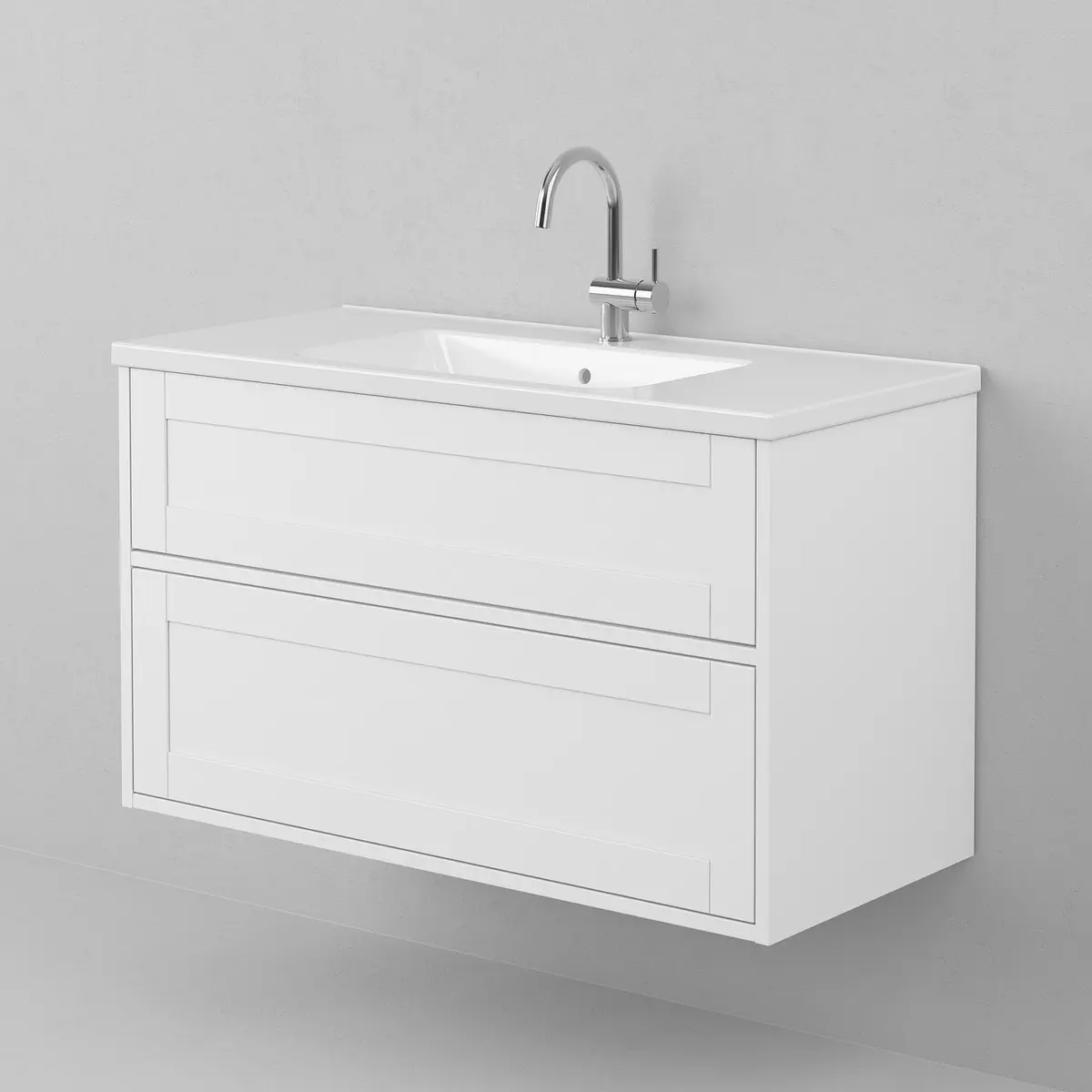 I Grand Classic får du badrumsmöbler med klassiska ramlucka i modern skandinavisk kontext tack vare de innanförliggande fronterna. En möbeldesign som för tankarna till New England. Uttrycket i Grand Classic ändras med dina val. I vitt med grepp i krom skapar du en lantlig känsla medan samma möbel i en mörk kulör ger en stramare och mer urban känsla, gärna ihop med svarta detaljer.