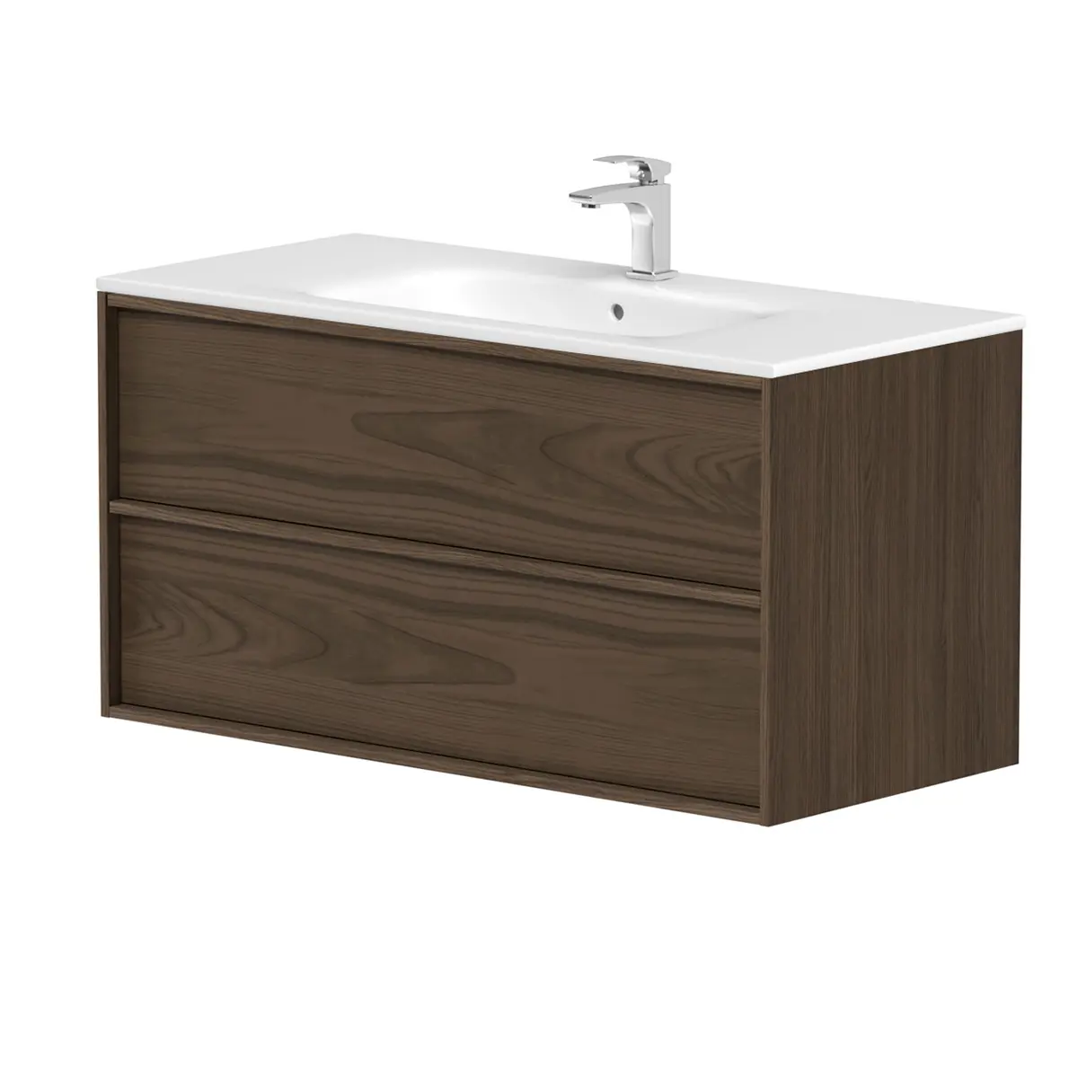 Kame Badrumsmöbel Home 100x45cm kommer i mörk ek och ek, här möts toppkvalité och funktion och har blivit en av våra absoluta toppsäljare bland badrumsmöbler. Kommoden har en vacker inramining med en list och integrerat handtag. Skandinavisk minimalistik design med enhetliga former och varma trätoner i en högkvalitativ ekfanér. Välj mellan flera bredder med nedsänkt handfat eller ett ovanpåliggande alternativ med en snygg bänkskiva!