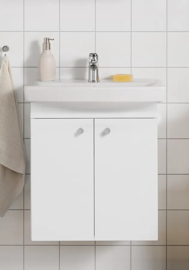 Tvättställsskåp med mjukstängande luckor och ett hyllplan. Tvättställ i porslin med överfyllnadsskydd ingår. Kromad knopp. Levereras färdigmonterad. Komplettera med PUM-vattenlås för kommod, 126 56 00 och bottenventil. Förberett för både golv- och väggavlopp. Justerbara upphängningsbeslag.