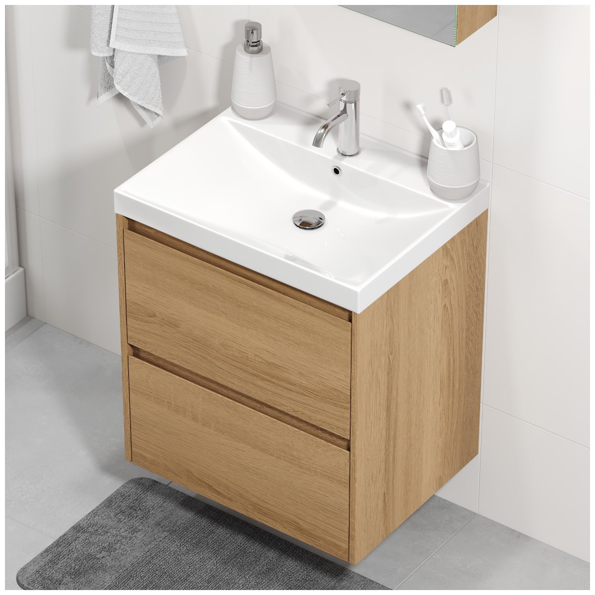 Denna stilrena badrumsmöbel kombinerar modern design med praktisk funktion och passar perfekt i både små och stora badrum. Möbeln finns i bredderna 60 cm och 80 cm samt i två tidlösa utföranden: varm ek eller elegant valnöt. Den är utrustad med ett nedsänkt handfat som ger ett enhetligt och lättstädat intryck.