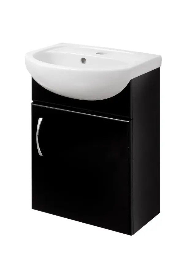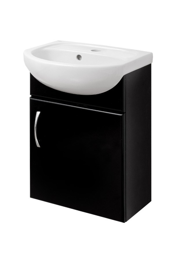 En nätt svart badrumsmöbel från danska Lope, som passar för det lilla badrummet eller gästtoaletten. Möbeln har slät lucka och rundat tvättställ i porslin.