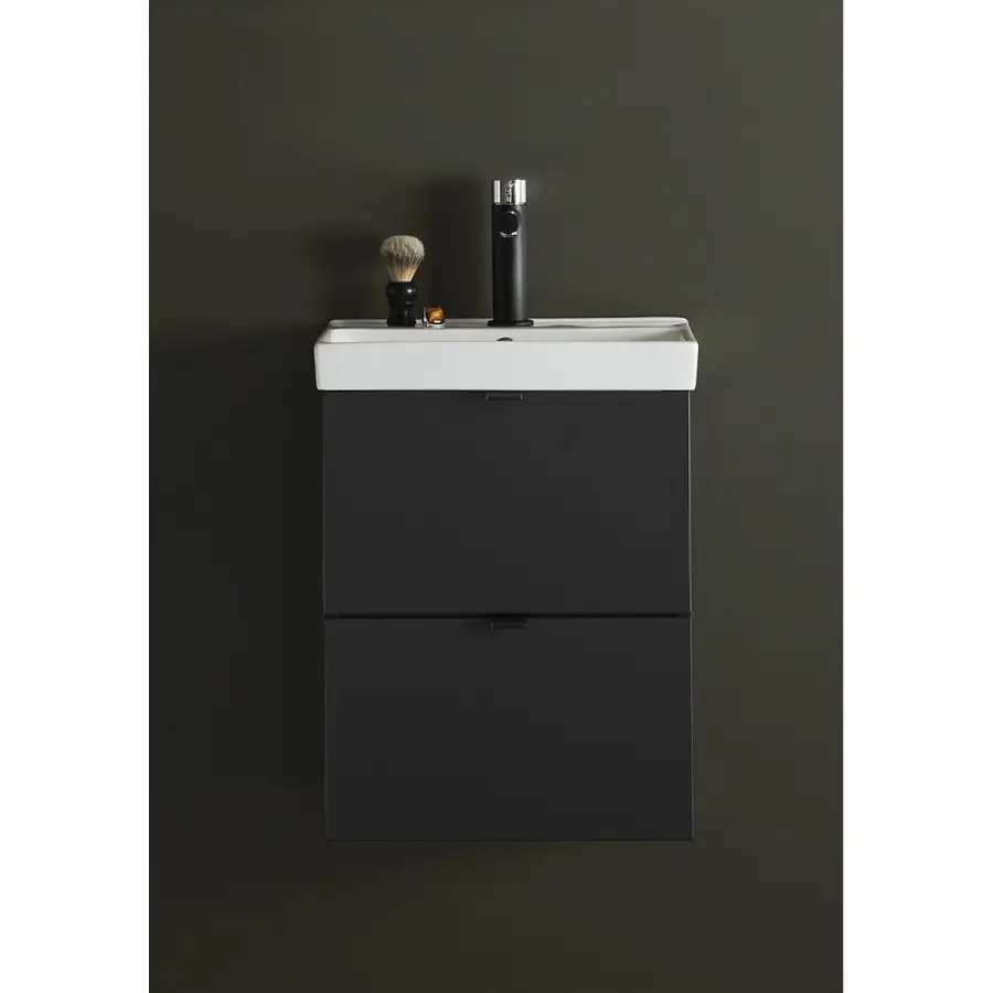Tvättställsskåp med två mjukstängande lådor. Enkelt att installera för en person med skena på vägg och justerbara upphängningsbeslag. Förberett för både vägg- och golvavlopp i bakkant för enkel montering. Levereras färdigmonterad. Komplettera med PUM-vattenlås för kommod 126 56 00. Välj till handtag. Elegant och nätt tvättställ i porslin med överfyllnadsskydd. Komplettera med bottenventil. Vi rekommenderar en blandare med strålsamlare till detta tvättställ.
