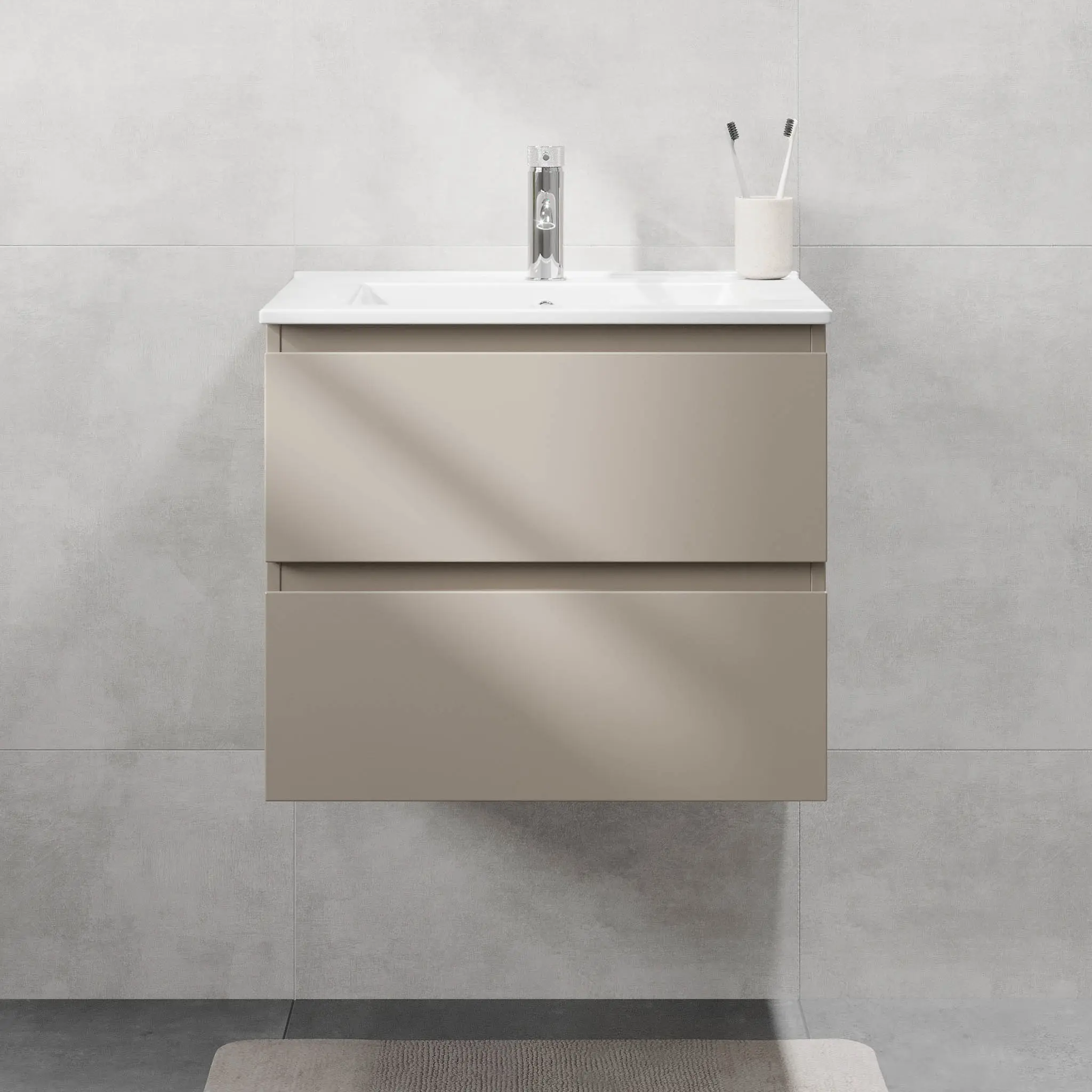 Det integrerade handtaget är diskret placeradt längs fronten och bidrar till ett rent, minimalistiskt utseende som passar både moderna och klassiska badrumsmiljöer.