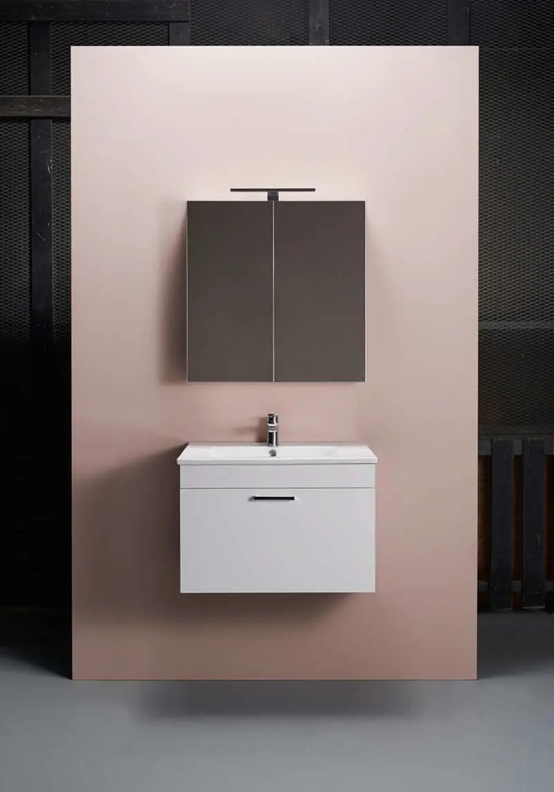 Tvättställsskåp med matt lack i vitt och svart eller i vit högblank med mjukstängande låda som ger generös förvaring. Inklusive nedsänkt handfat och spegel. Tvättställsskåpet är enkelt att installera för en person med skena på vägg. Förberett för både vägg- och golvavlopp i bakkant för enkel montering. Justerbara upphängningsbeslag. Komplettera med PUM-vattenlås, 126 56 00 samt Go LED-lampa. Sätt din personliga stil med ett av våra handtag eller knoppar.