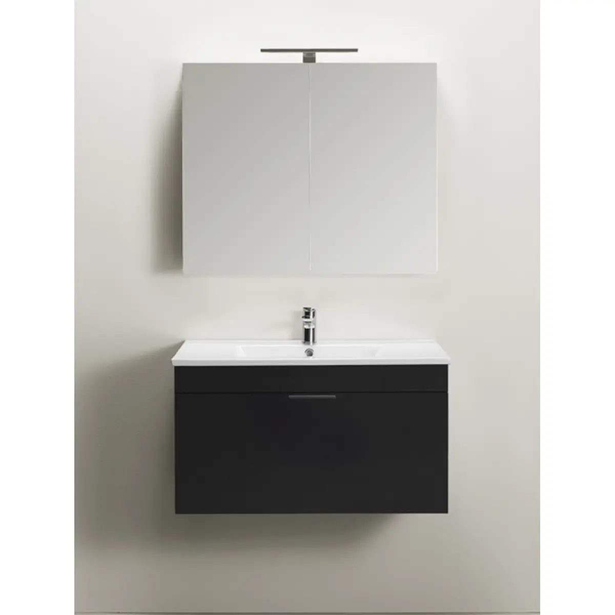 Tvättställsskåp i sammetsmatt lack i svart eller vitt med mjukstängande låda som ger generös förvaring. Inklusive nedsänkt handfat och spegel. Tvättställsskåpet är enkelt att installera för en person med skena på vägg. Förberett för både vägg- och golvavlopp i bakkant för enkel montering. Justerbara upphängningsbeslag. Komplettera med PUM-vattenlås, 126 56 00 samt Go LED-lampa. Sätt din personliga stil med ett av våra handtag eller knoppar.