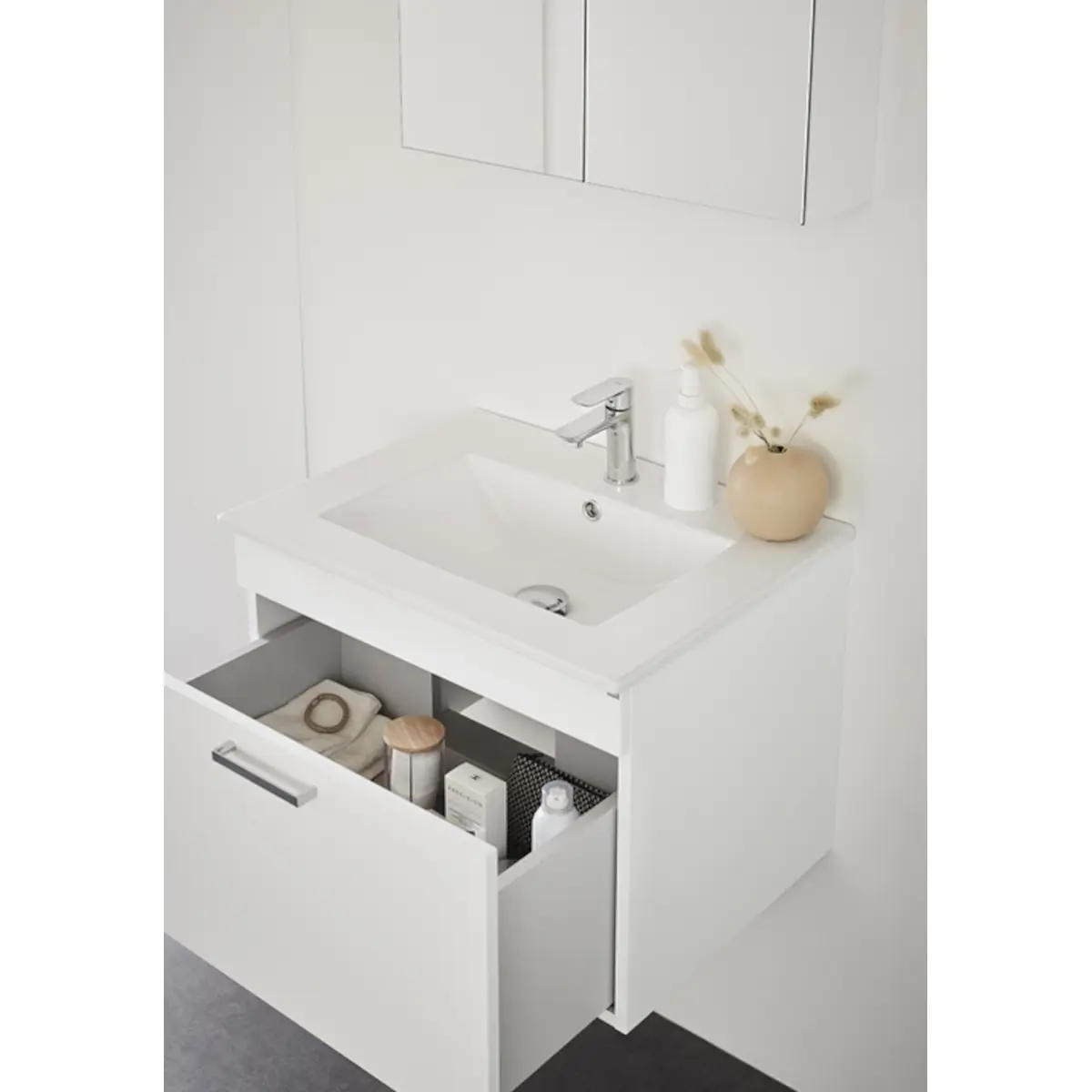 Tvättställsskåp i sammetsmatt lack i svart eller vitt med mjukstängande låda som ger generös förvaring. Inklusive nedsänkt handfat och spegel. Tvättställsskåpet är enkelt att installera för en person med skena på vägg. Förberett för både vägg- och golvavlopp i bakkant för enkel montering. Justerbara upphängningsbeslag. Komplettera med PUM-vattenlås, 126 56 00 samt Go LED-lampa. Sätt din personliga stil med ett av våra handtag eller knoppar.