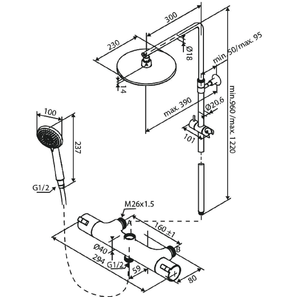 Takdusch Core i 160 cc med tre olika duschfunktioner. Justerbar höjd mellan 960-1220mm.