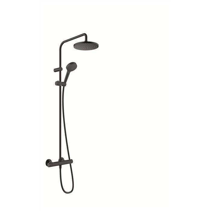 Ett vackert svart matt takduschpaket med blandare, handdusch och 205mm takdusch.