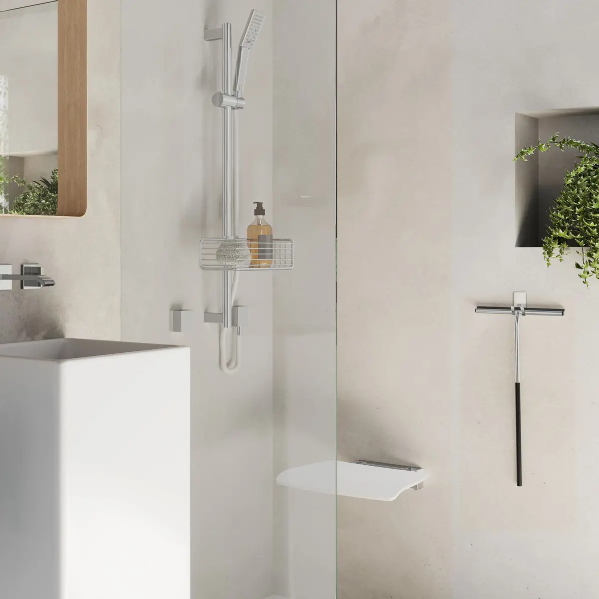 Stilren duschskrapa med ett extra långt skaft och en självhäftande hållare. Den praktiska lösningen gör att du inte behöver ha duschskrapan på golvet. Modellen har ett handtag med runda kanter och en stilren fyrkantig bakplatta. Den är tillverkad av rostfritt stål med en kromad blank yta, mattsvart färg och ett svart blad i silikon. Med en duschskrapa nära till hands håller du dina duschväggar fina och undviker kalkfläckar.