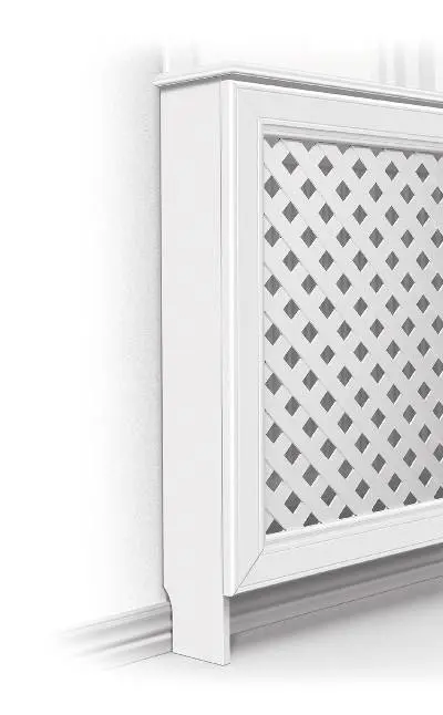 Gavelsidor för elementskydd i vitlackad (NCS S0500-N, glans 35) MDF där monteringsdetaljer medföljer. Kapningsbara för anpassning till dina önskade mått. Säljes i par.