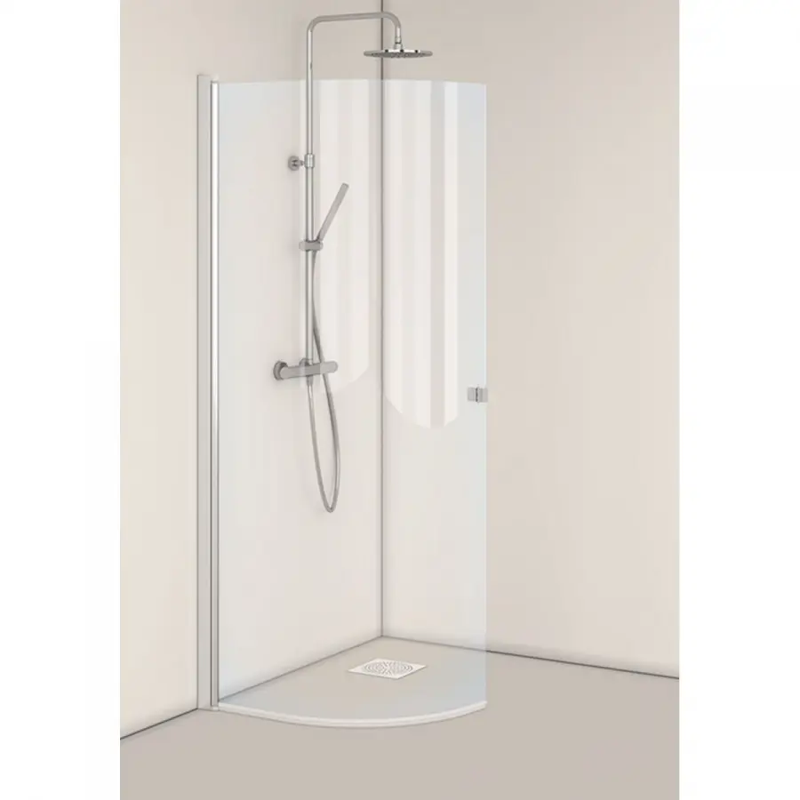 Stor böjd duschdörr med klart glas som passar det mindre badrummet eftersom den kan fällas in när den inte används. Duschdörren är stabil med en väggprofil i eloxerad aluminium som kan monteras med skruv eller limbrickor. Den har en patenterad lösning för enkel installation och justering, Hafa's InstaQuick™. Duschdörren har lyftgångjärn för att den inte skall ta i golvet vid öppning och är vändbar så du kan välja vilken vägg den skall installeras på. 6 mm härdat säkerhetsglas. Höjd 2000 mm. Kan monteras med utanpåliggande rör, 35 mm. 18 mm släplist och handtag ingår. Duschdörren kan kombineras med andra dörrar och väggar i IglooPro-serien.