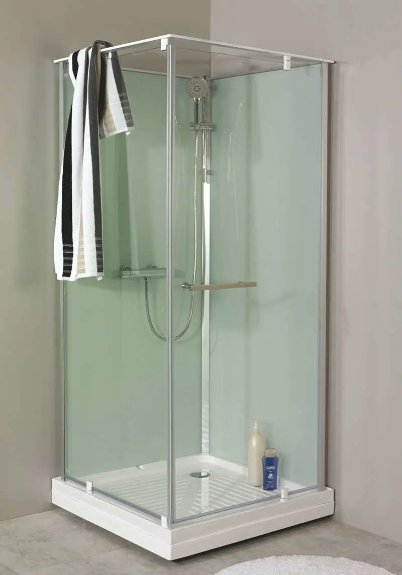 Silvermatt finish. 5mm härdat säkerhetsglas. Bakväggar i svart eller vitt säkerhetsglas. Kar i sanitetsakryl med avtagbar front. Handtag i rostfritt stål. Duschkabin i aluminium och rostfritt stål. Levereras med 3-funktions duschset. Magnetfunktion vid stängning. Anpassade för blandare C-C 150–160mm för kabingenomföring ½". Rostfritt svetsat stativ. Handtag ingår.