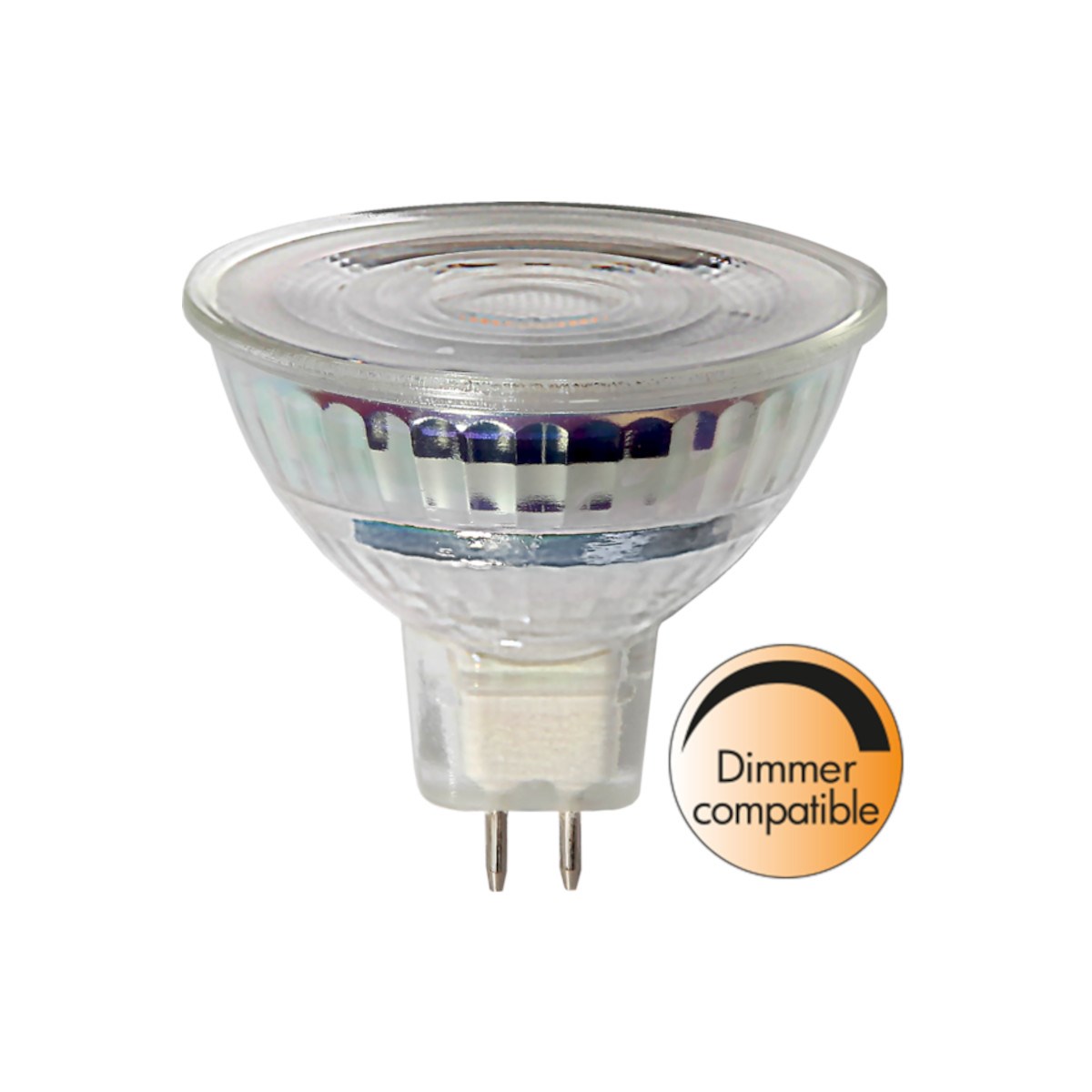 LED spotlight i glas. Sockeln är GU5,3, ljuset är varmvitt och den är dimmerkompatibel.