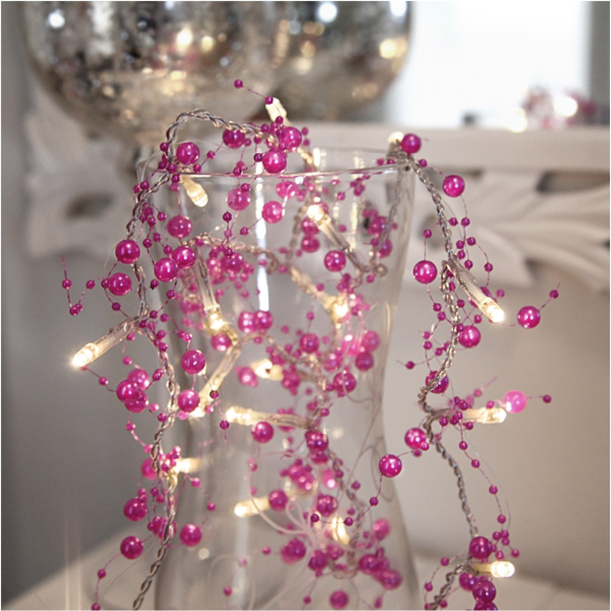 Fin dekorationsslinga med 20 LED-ljuskällor med cerise pärlor. Kan användas vid diverse dekorationer, vid tex dukningar, blomsterarrangemang, i fönster, på väggen osv. Slingan är batteridriven och har en smidig timerfunktion.