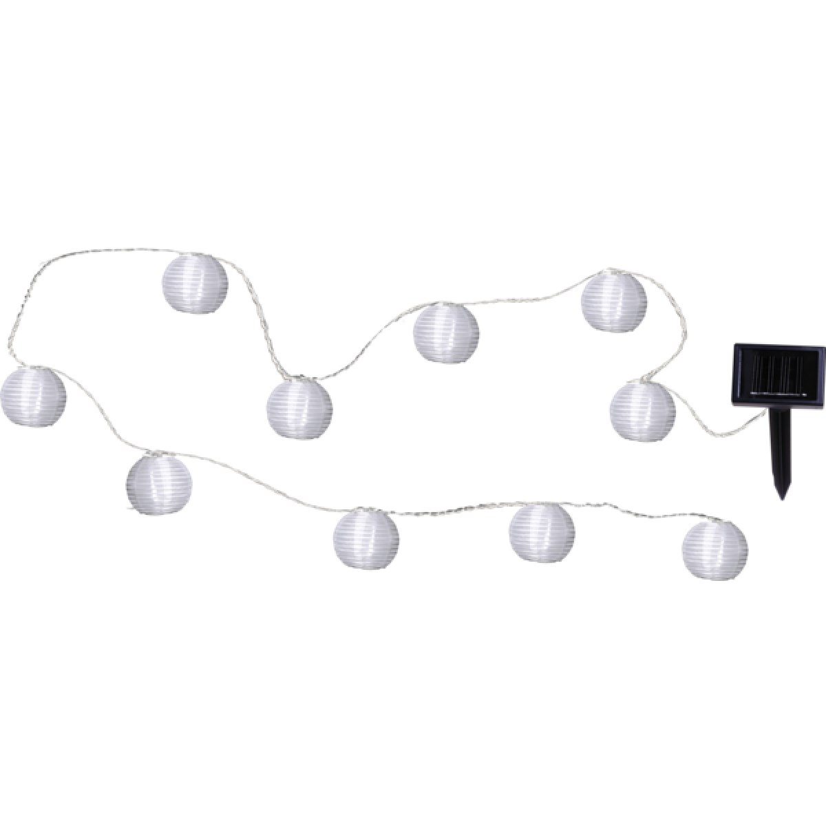 Solcellsdriven ljusslinga fint dekorerad med vita risbollar. Ljusslingan har 10 kallvita LED-ljuskällor. Enkelt, praktiskt och miljövänligt sätt att dekorera med i trädgården. Perfekt till vardags och fest.