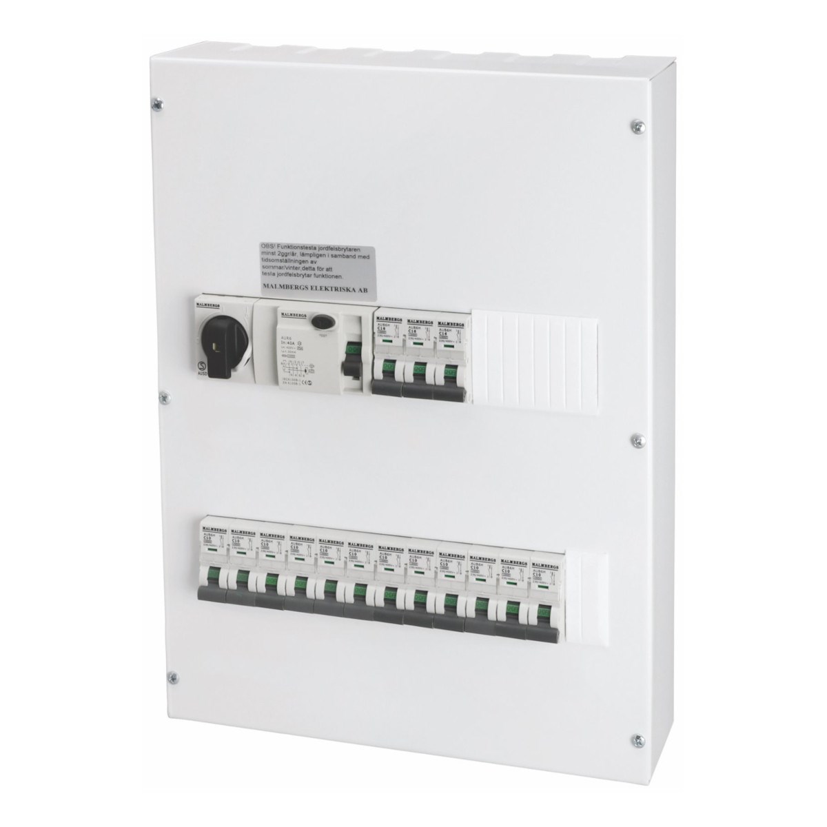 Malmbergs kompletta normsäkringscentral är utförd enligt gällande normer. Huvudbrytare, normsäkringar och jordfelsbrytare är elektriskt anslutna med RK 6 mm² samt 3-polig samlingsskena 10 mm². Monterad med 1-poliga säkringar C-typ och 4-polig jordfelsbrytare 30mA Typ A.