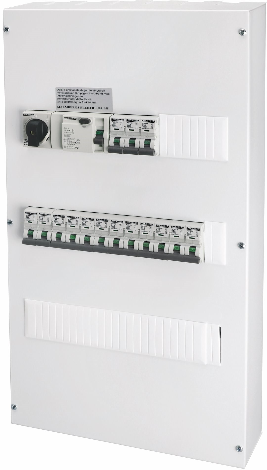 Malmbergs kompletta normsäkringscentral är utförd enligt gällande normer. Huvudbrytare, normsäkringar och jordfelsbrytare är elektriskt anslutna med RK 6 mm² samt 3-polig samlingsskena 10 mm². Monterad med 1-poliga säkringar C-typ och 4-polig jordfelsbrytare 30mA Typ A.