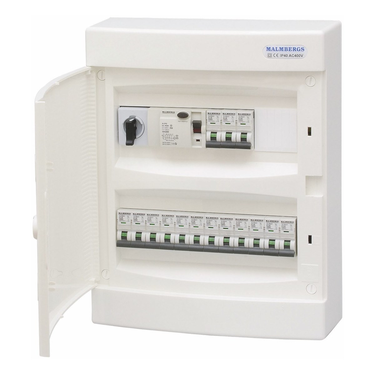 Malmbergs kompletta normcentraler monterade i halogenfria kapslingar och utförda enligt gällande normer. Huvudbrytare, dvärgbrytare samt jordfelsbrytare är elektriskt anslutna med RK 6 mm² samt 3-polig samlingsskena 10mm². Monterade med 1-poliga dvärgbrytarna av C-typ, 10kA och med 4-poliga jordfelsbrytare 30mA Typ A, 10kA. För komplettering av andra normapparater såsom kopplingsur, kontaktorer m.m. se Aurora-serien. Levereras komplett med vit dörr som kan kompletteras med transparent dörr och/eller nyckellås.
