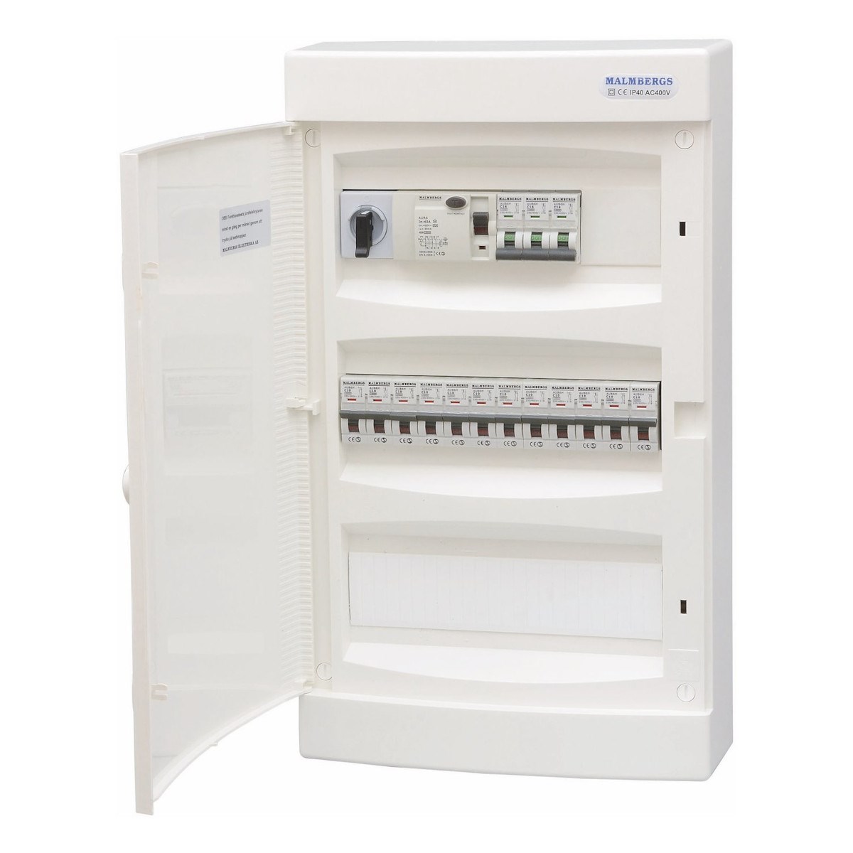 Malmbergs kompletta normcentraler monterade i halogenfria kapslingar och utförda enligt gällande normer. Huvudbrytare, dvärgbrytare samt jordfelsbrytare är elektriskt anslutna med RK 6 mm² samt 3-polig samlingsskena 10mm². Monterade med 1-poliga dvärgbrytarna av C-typ, 10kA och med 4-poliga jordfelsbrytare 30mA Typ A, 10kA. För komplettering av andra normapparater såsom kopplingsur, kontaktorer m.m. se Aurora-serien. Levereras komplett med vit dörr som kan kompletteras med transparent dörr och/eller nyckellås.
