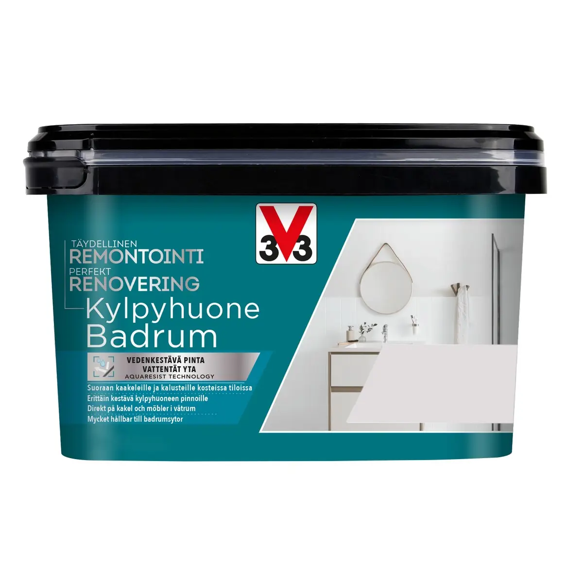 V33 Perfekt Renovering är en serie användarvänliga produkter som underlättar för renovering av hemmets olika ytor; kök, badrum, golv och trappor. Färgerna har utmärkt täckning (minst 98% opacitet), är vattenburna och ger en högklassig, slät och jämn finish, oavsett underliggande yta – dessutom utan grundfärg.