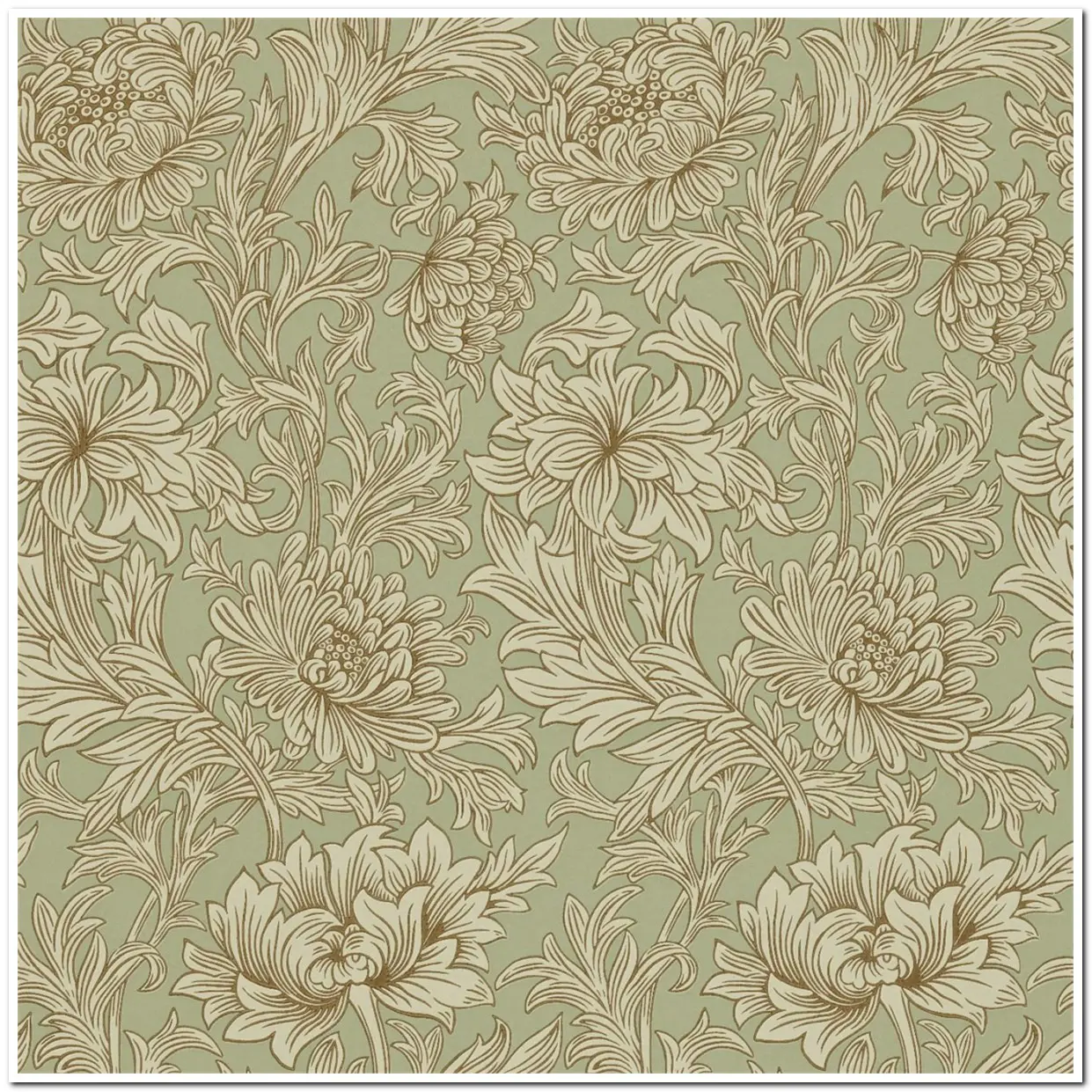William Morris & Co Volume V Chrysanthemum Toile DMOWCH104 Eggshell / Gold är en grön och blå papperstapet med växter...