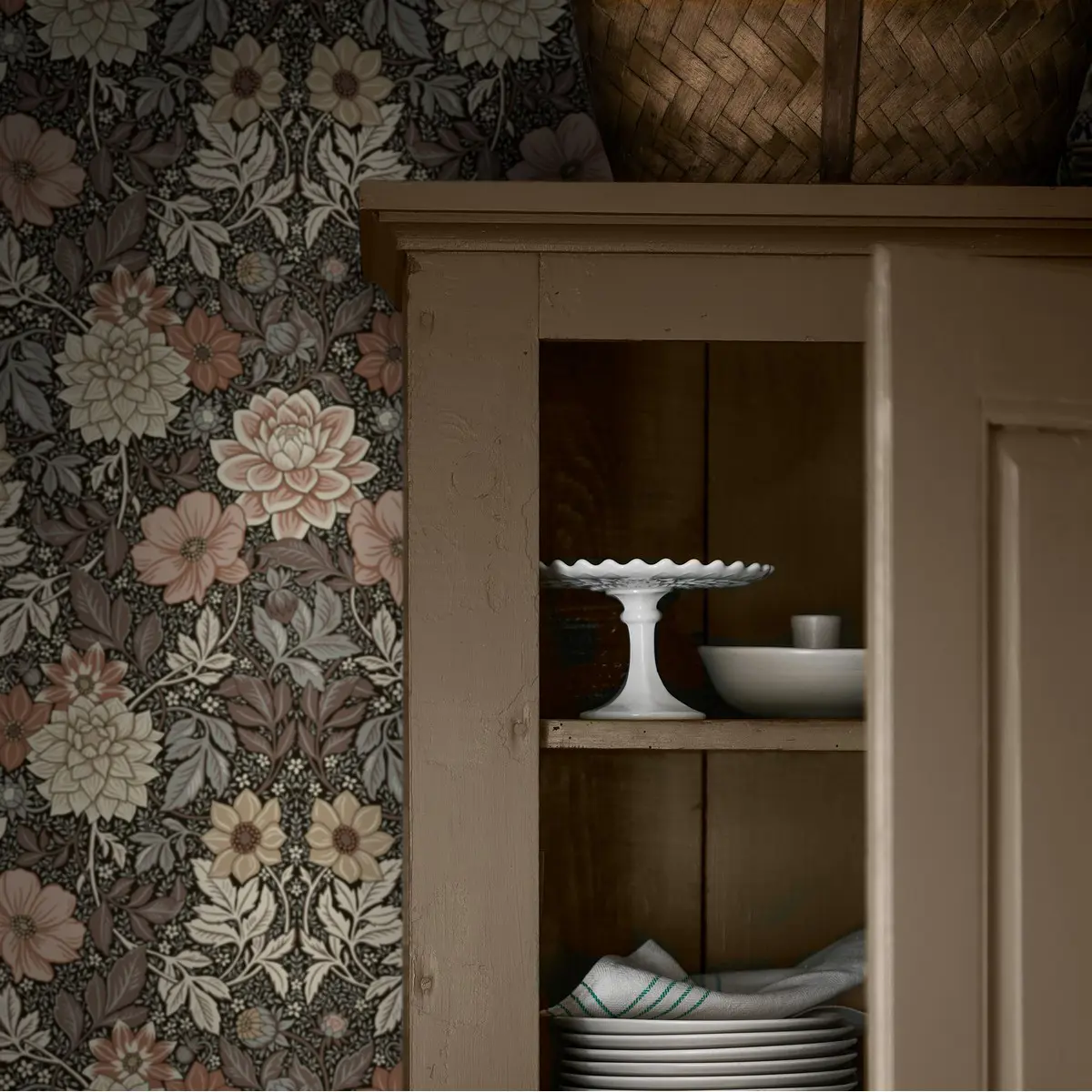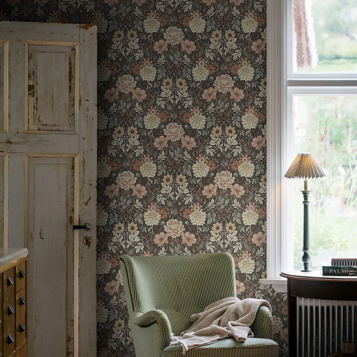 Boråstapeter Falsterbo III Special Edition Dahlia Garden 7689 är en brun,rosa och beige blommig easy up tapet.Storblommiga tapeten Dahlia Garden pryds av överdådiga dahlior och rosenskäror mot ett slingrande bladverk. Mönstret påminner om Arts & Crafts-rörelsens stilideal, men målades av designern Jenny Hahne Gadd för bara några år sedan.Här ser du tapeten i en mörk, lugn färgställning som doftar sofistikerad vintage. Blomster i puderrosa, vaniljgult och blek terrakotta mot en mörkt brun botten. Det sirliga bladverket i grått bryter av, och gör att tapeten gifter sig fint med såväl varma som svalare toner.Tapeten är easy up och rekommenderas att sättas upp med lim avsett för easy up. Det går åt ca 1 liter lim per tapetrulle beroende på underlaget.