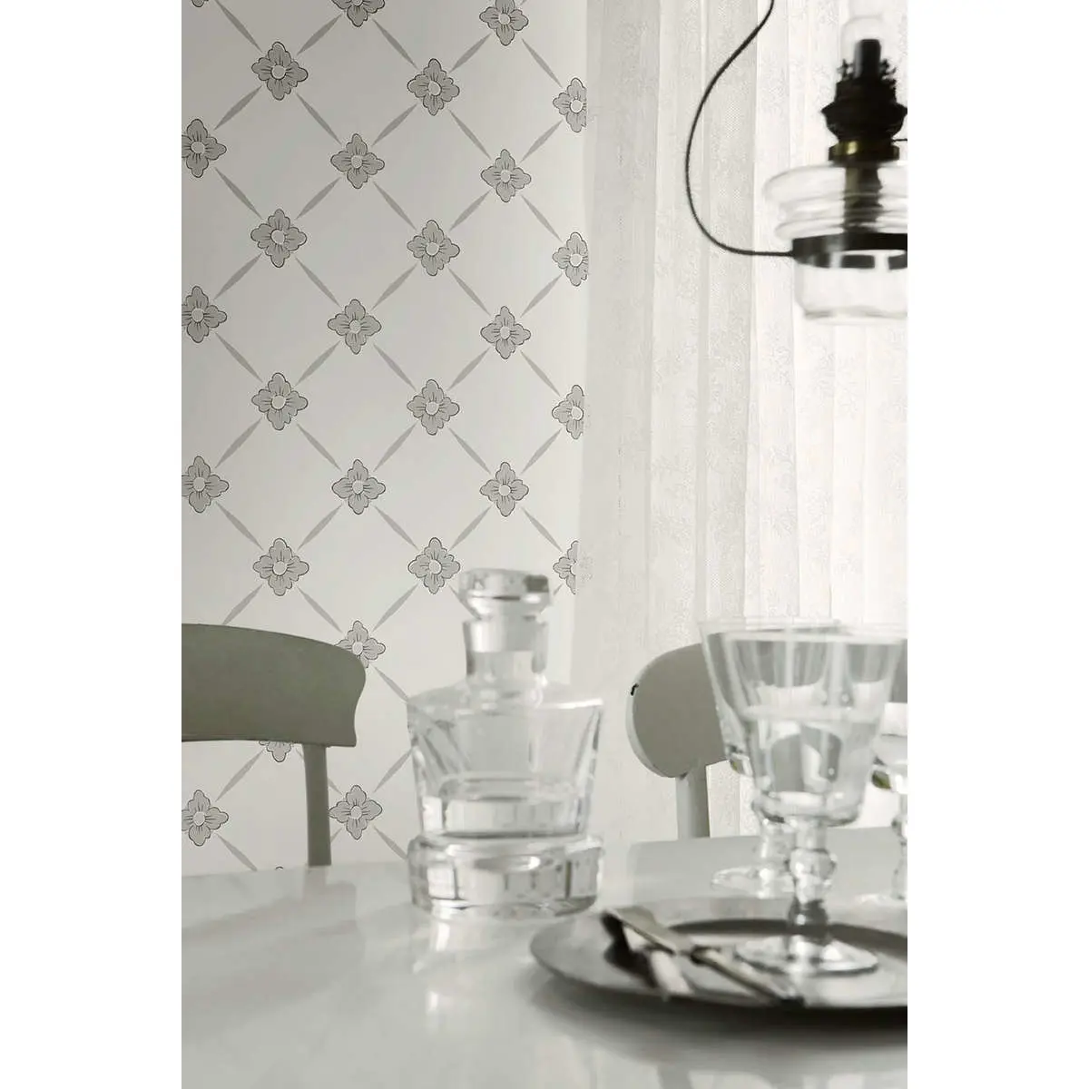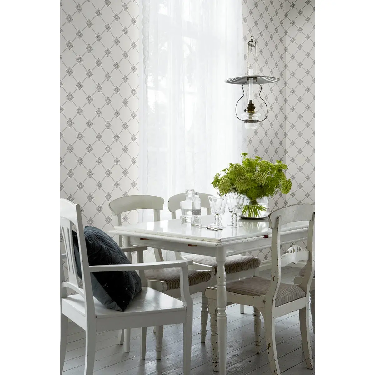 Boråstapeter Anno Linné 4505 Linné är en tidstypisk gustaviansk tapet som också drar åt rokoko med det sneda rutmönstret som binds ihop av fyrbladiga blommor. Skimrande silver i blommornas öga blir pricken över i! Linné är trogen sitt originalmönster men varsamt uppdaterad är entapet som passar lika bra i sovrum som i matsal. Tapeten Linné finns i två färgställningar, här ser du det grå mönstret mot en crémevit botten.I tapetkollektionen Anno hittar du en skatt av gammaldags tapeter i nytryck. Här finns originalmönster från olika stilar och epoker som till exempel rokoko, art déco och jugend samt sekelskiftet och den gustavianska tiden. En fantastisk svensk tapettradition och ett kulturhistoriskt arv vi vill förvalta och hålla levande.De historiska tapeterna kommer från slott och herrgårdar men också från pigkammare och enklare hem. Medaljongtapeter, stänktapeter, storblommiga och småblommiga - alla tapetmönster har en verklig historia att berätta, och i våra varsamma tolkningar får berättelserna nytt liv.