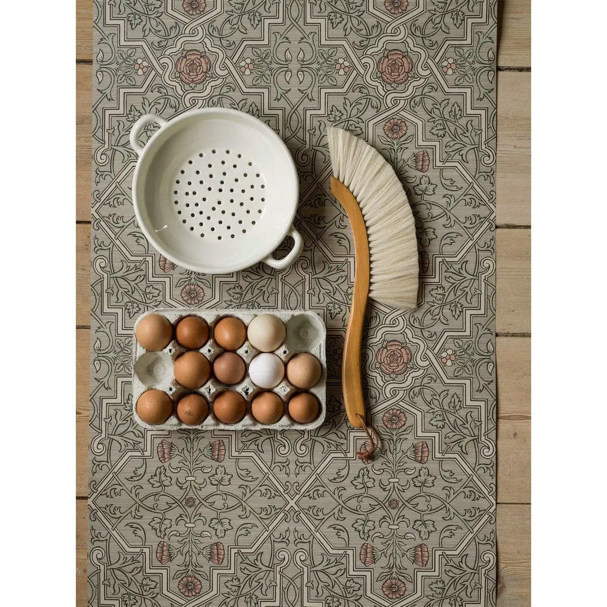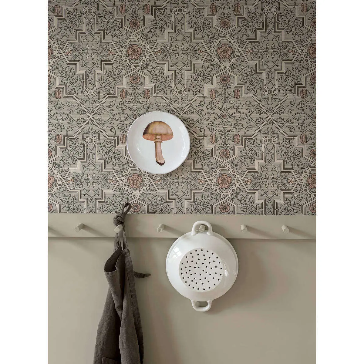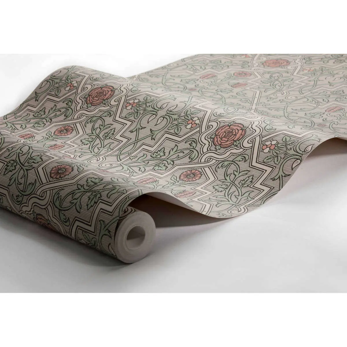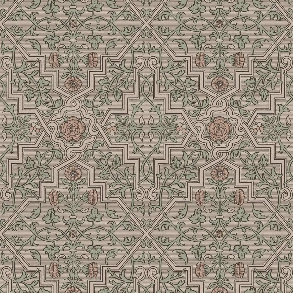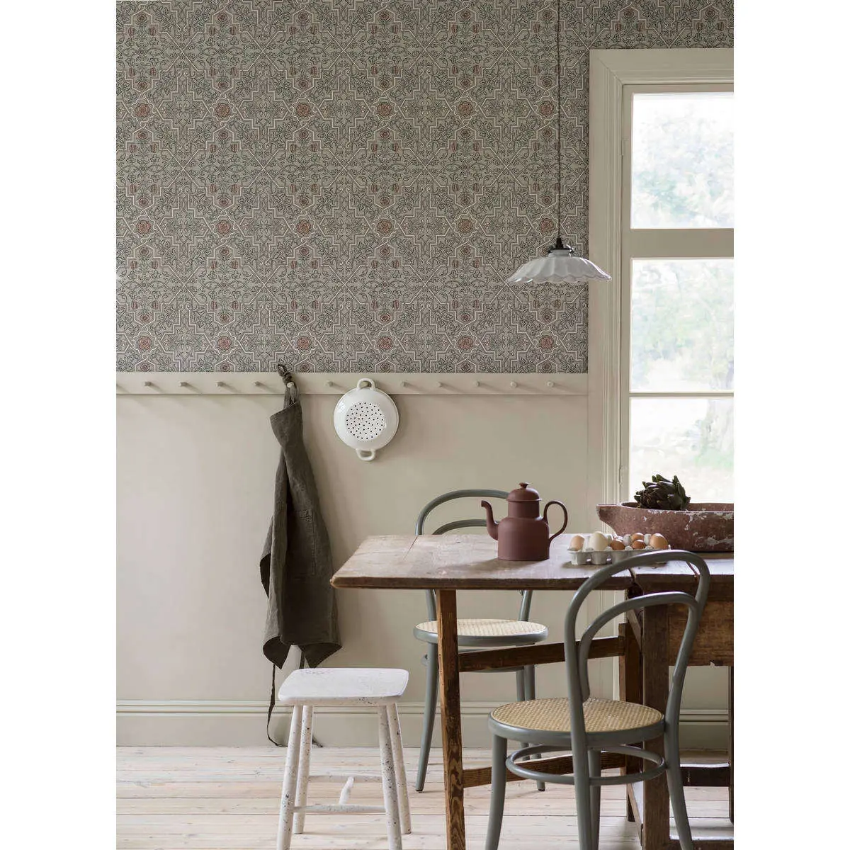 Boråstapeter Anno Rosenvinge 4501. Tapeten Rosenvinge är en sober renässanstapet i tre mjuka färgställningar. Mönstret är snart 500 år gammalt och hämtat från Nordens äldsta papperstapet! Här ser du det Rosenvinge i mjukt beige, olivgröna och brända nyanser i kontrast till matt svart.