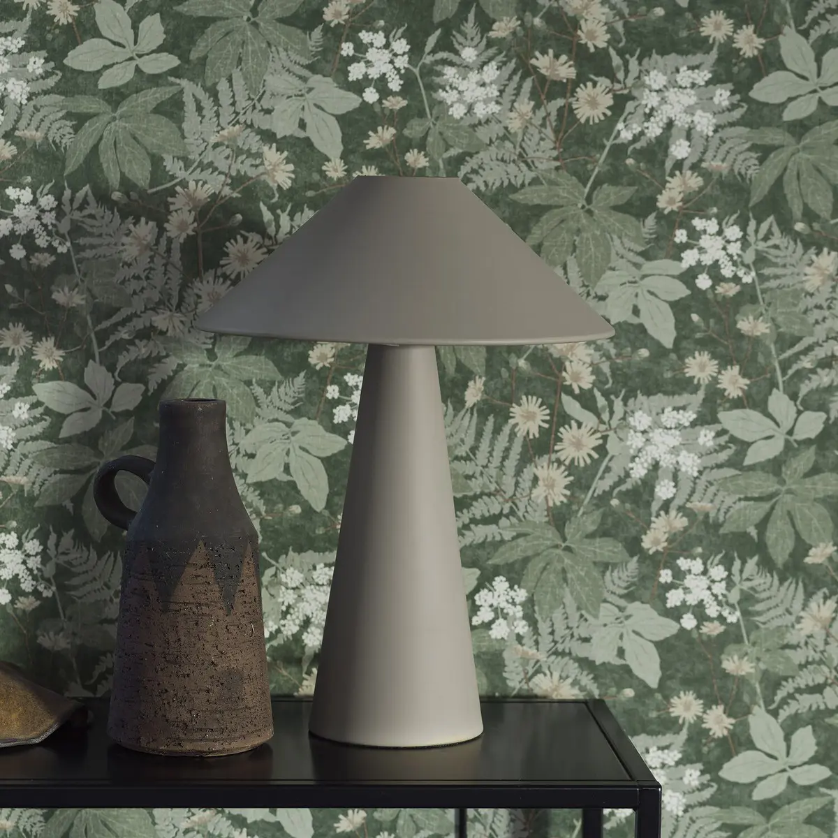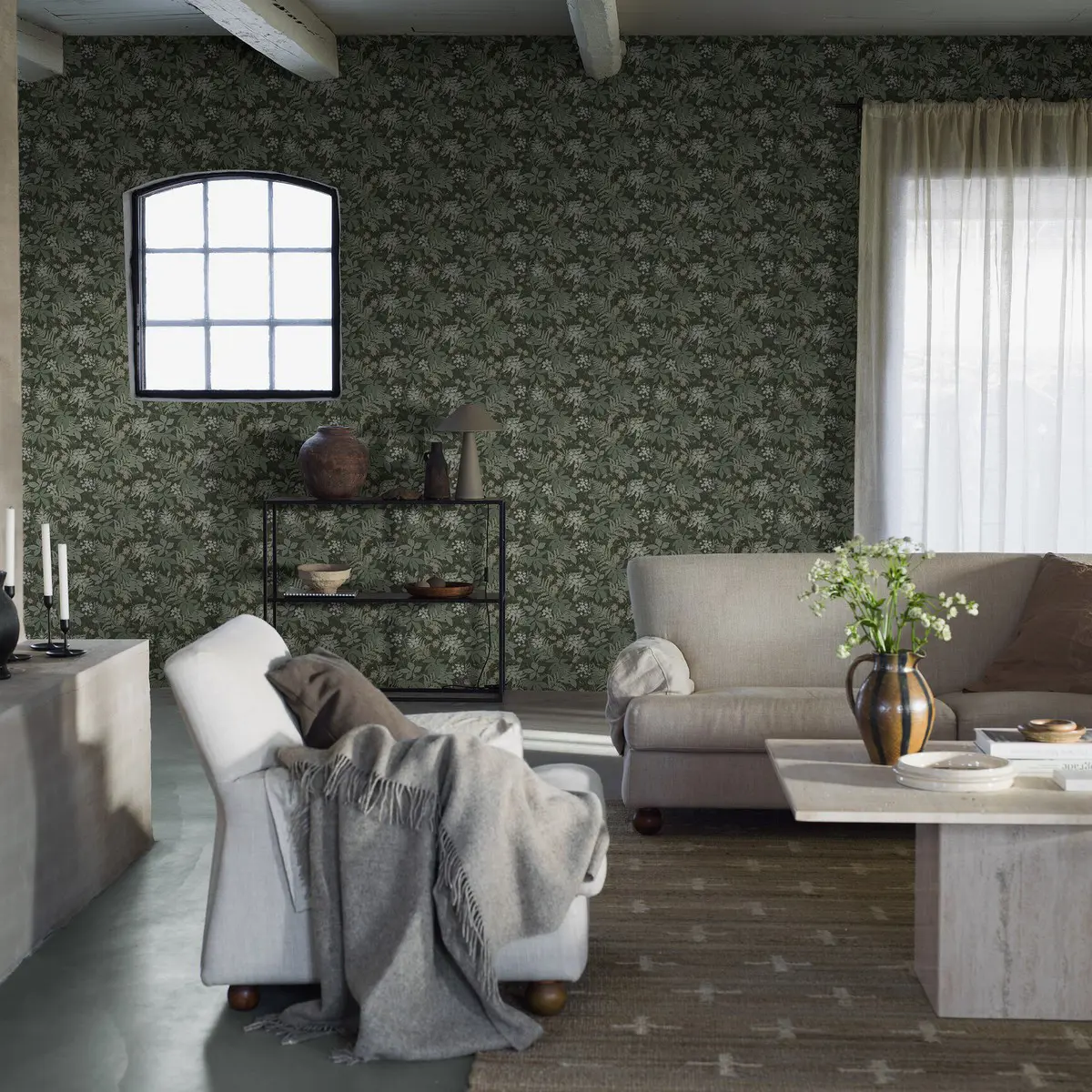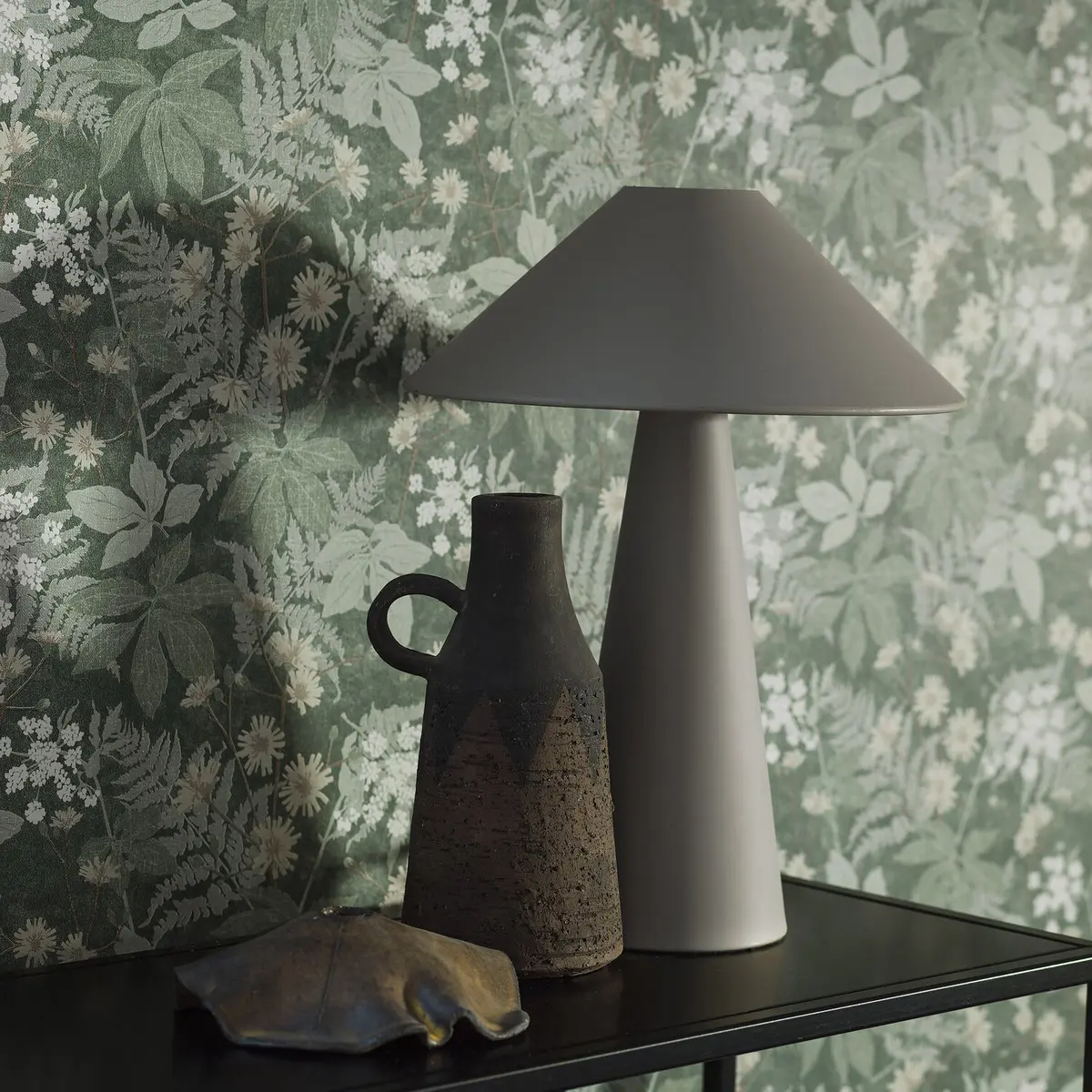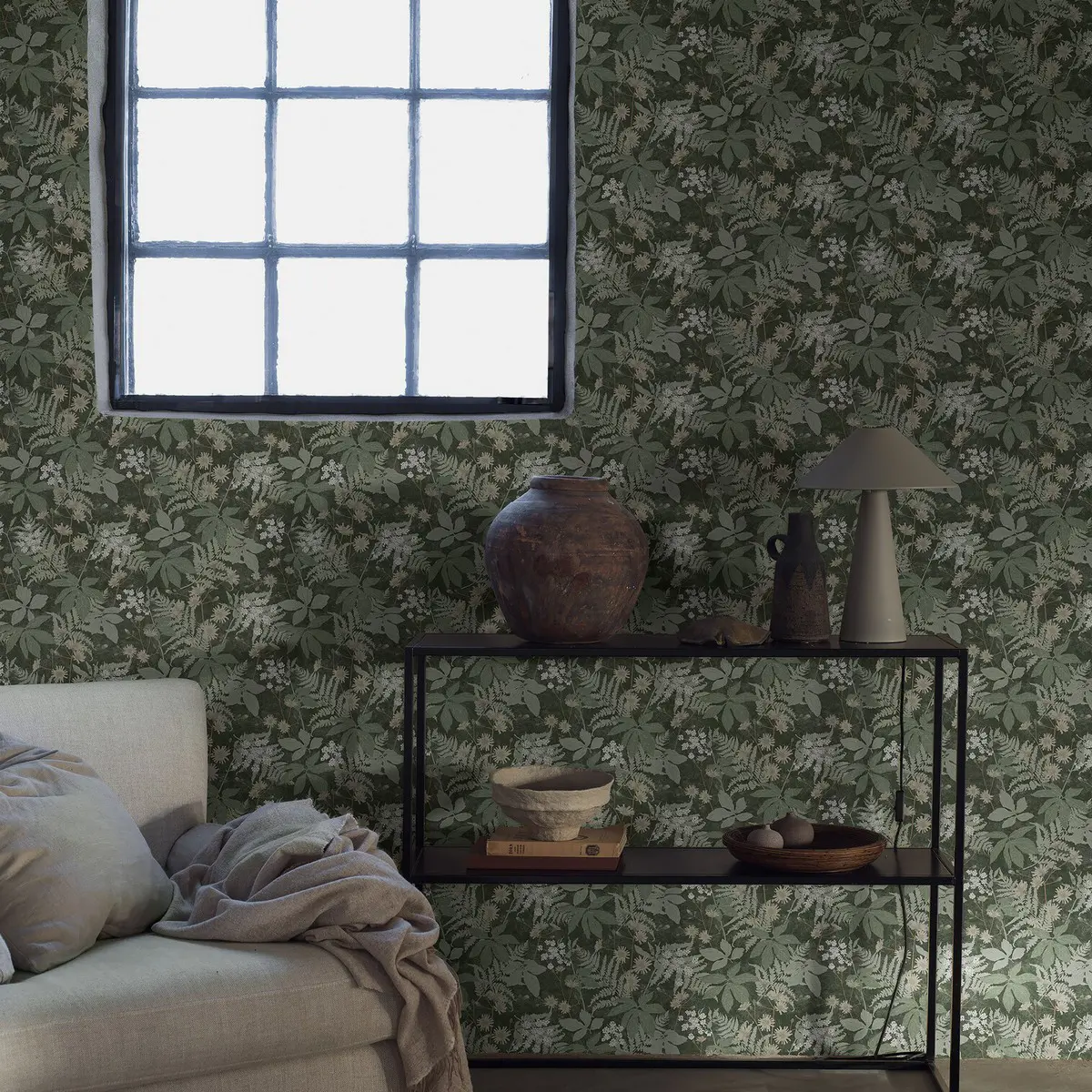 Den lummigt gröna tapeten Lindskog pryds av ett stiliserat, botaniskt mönster av vackra blommor och blad på en melerad, vävliknande yta. En modern, skandinavisk tapet inspirerad av Österlens höga, djupa skogar. Den mörka, stormönstrade mönsterbilden ger rummet en vilsam, ombonad och harmonisk känsla. Lindskog finns i tre behagliga färgställningar. Här ser du tapeten i mörka, svala nyanser av skogsgrönt med ljusare detaljer i grågrönt, brunt, beige och vitt.