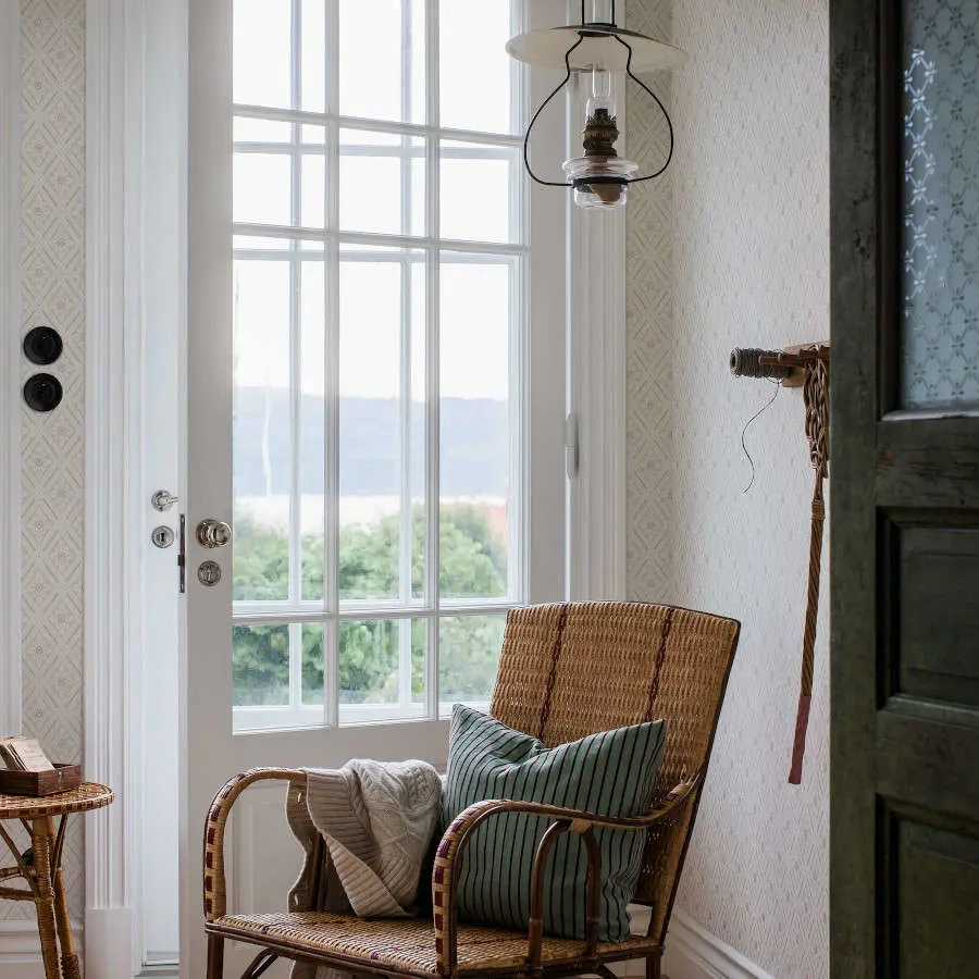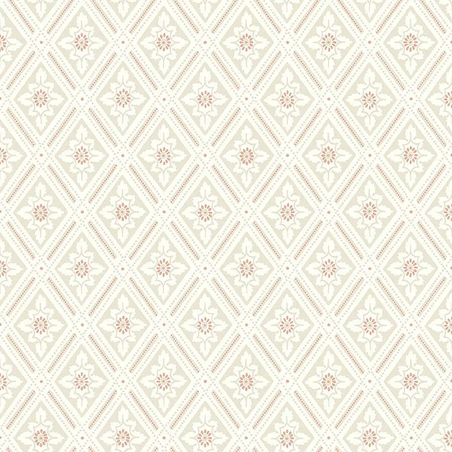 Boråstapeter Falsterbo III Ester 7660. Ester är en klassisk tapet vars mönster är hämtat från Boråstapeters arkiv med historiska tapeter. Mönstret kallas trellis, som äri engelskans ord för blomsterspaljé. Ester gör sig bra i till exempel kök, hall eller trapphus och finns i tre olika färgställningar. Alla är tryckta med flödigt limtryck för en vackert levande yta och ett ombonat uttryck. Här ser du Ester med varmbeige botten och mönster i vitt och dämpat rostrött som drar åt brunt.