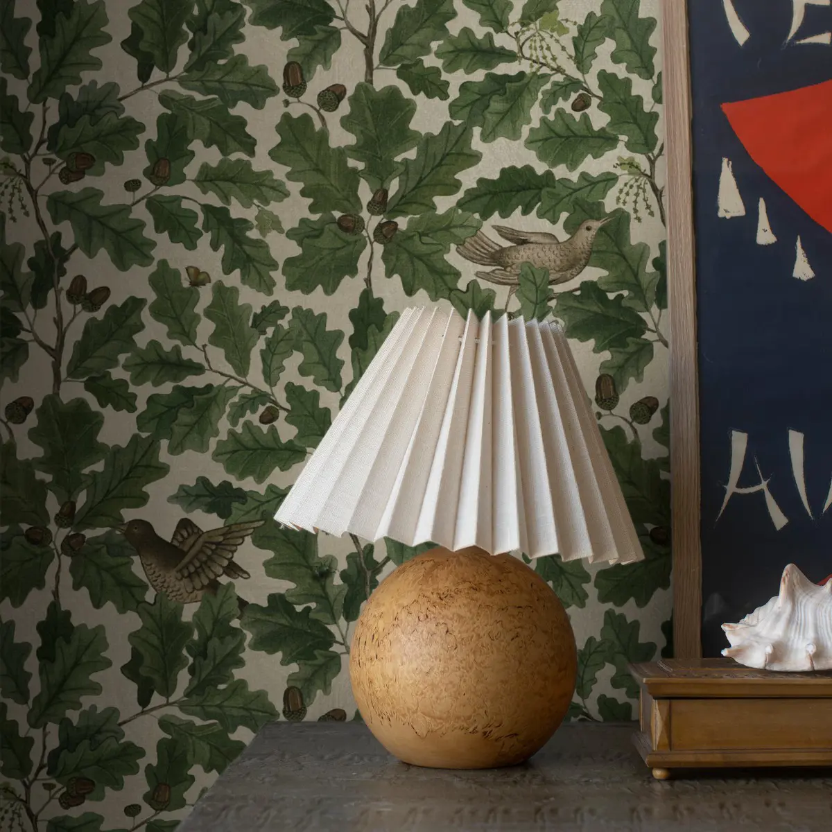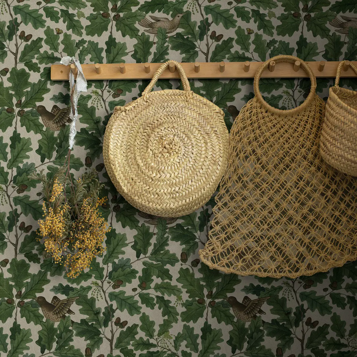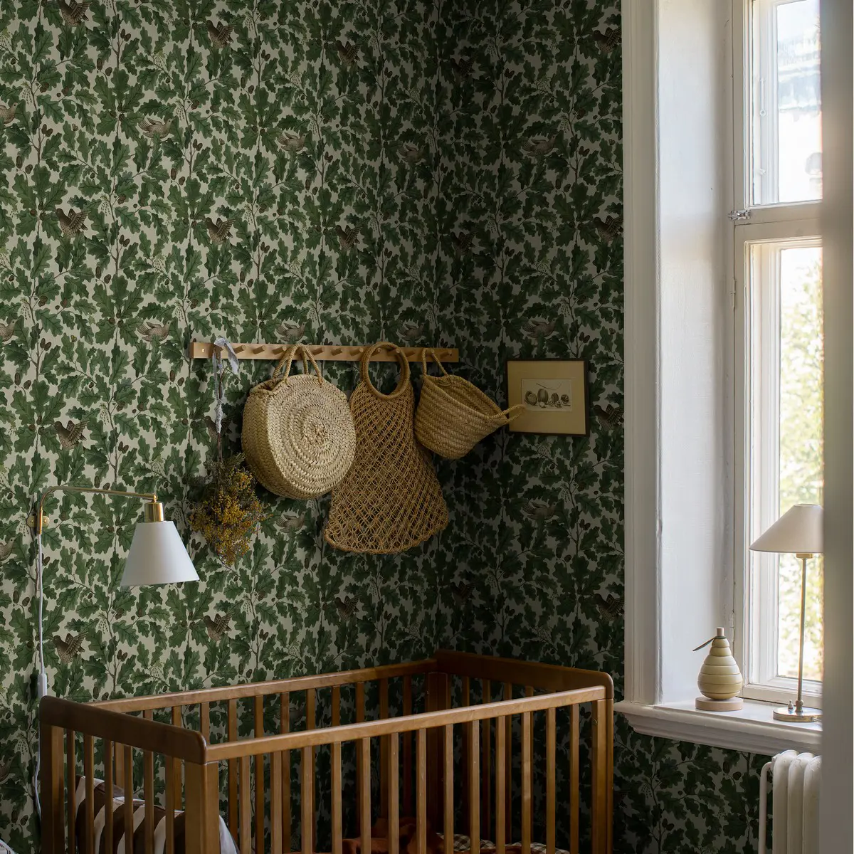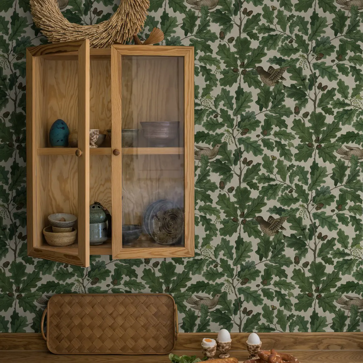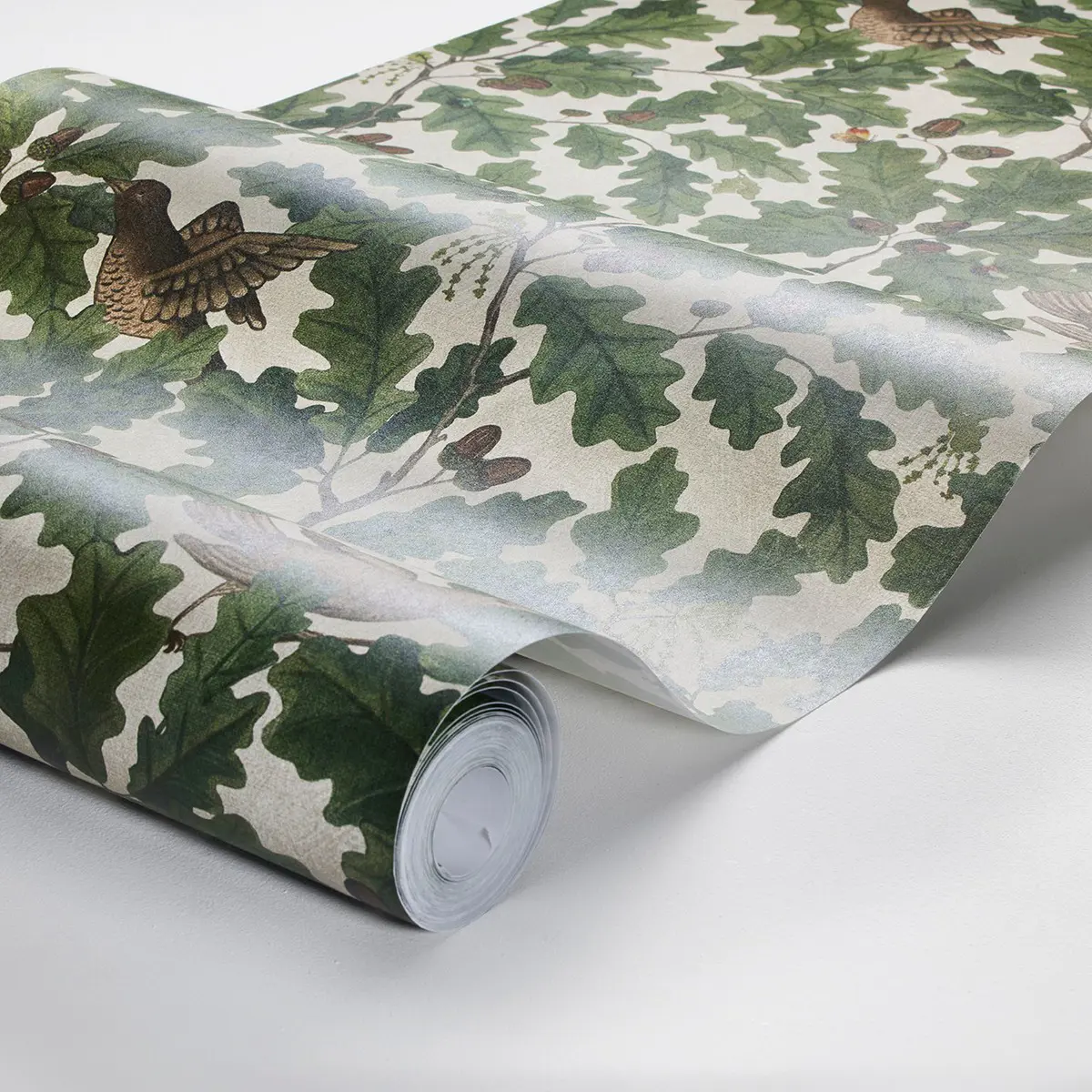 Den mönstrade tapeten In the Oak fyller rummet med skogens grönska och härliga livskraft. Den ståtliga eken är ett mytomspunnet träd med fantastiskt vackert bladverk. Dessutom huserar en ek ända upp till 1000 djurarter. Om du tittar noga ser du ett 20-tal olika insekter i det frodiga lövverket på denna tapet. Mönstret är målat i akvarell för att sedan tryckas i 2 färgställningar. Här ser du In the Oak med ljust gråbeige botten.