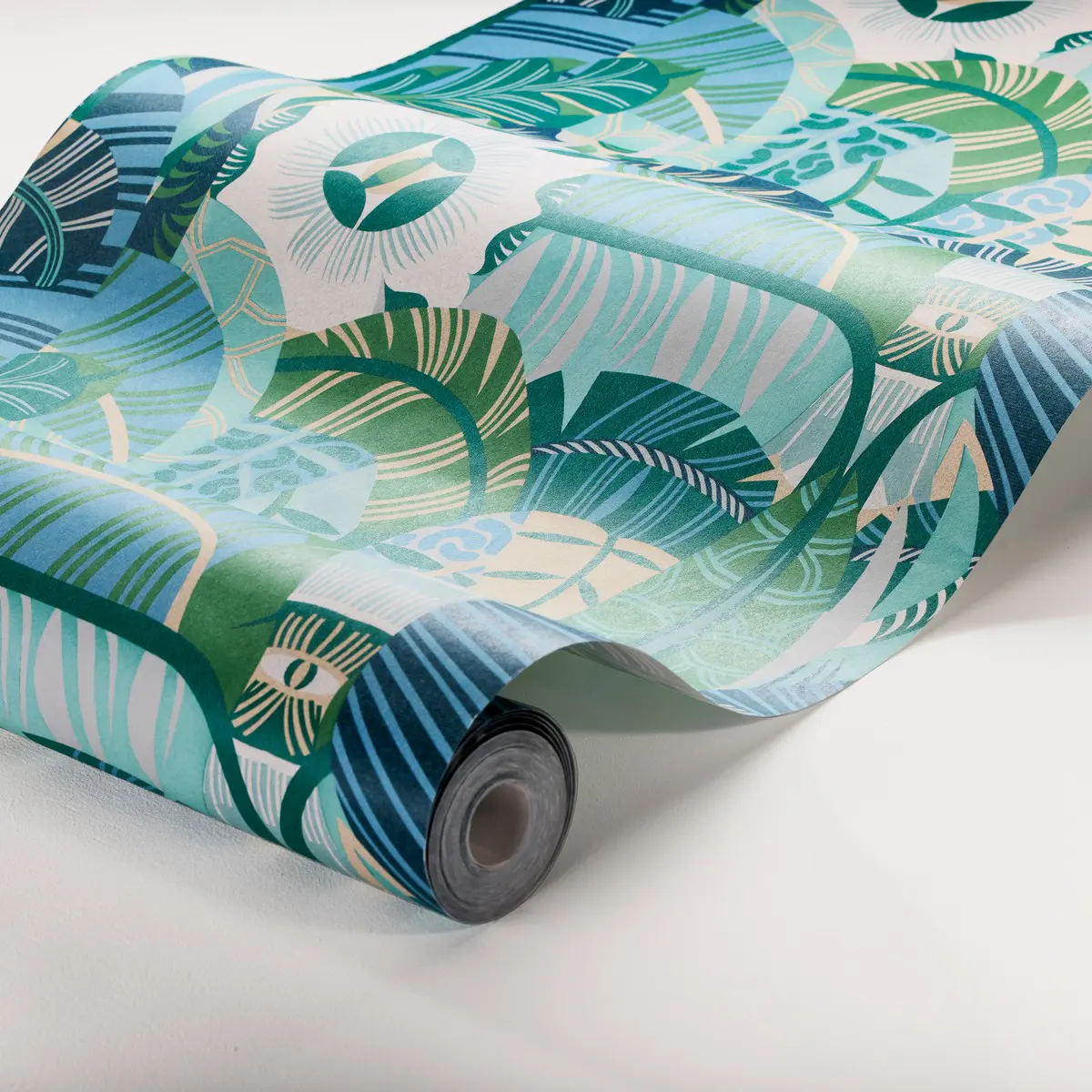Boråstapeter Swedish Designers Hypnotic Safari 2069 är en blå och grön easy up tapet med grafiska växter som motiv.