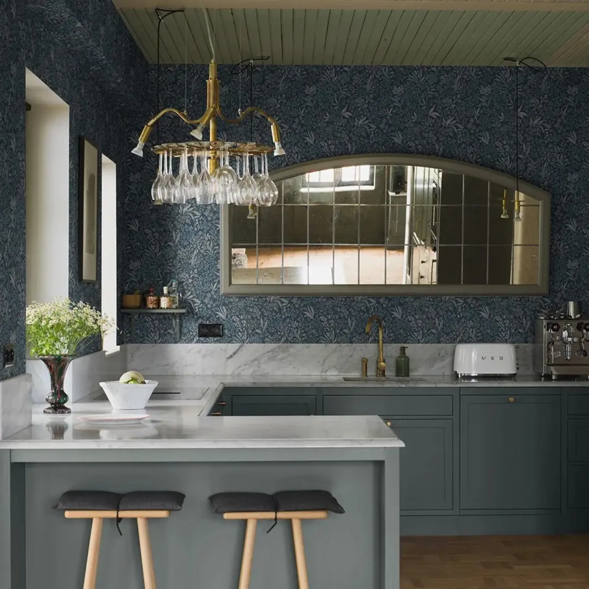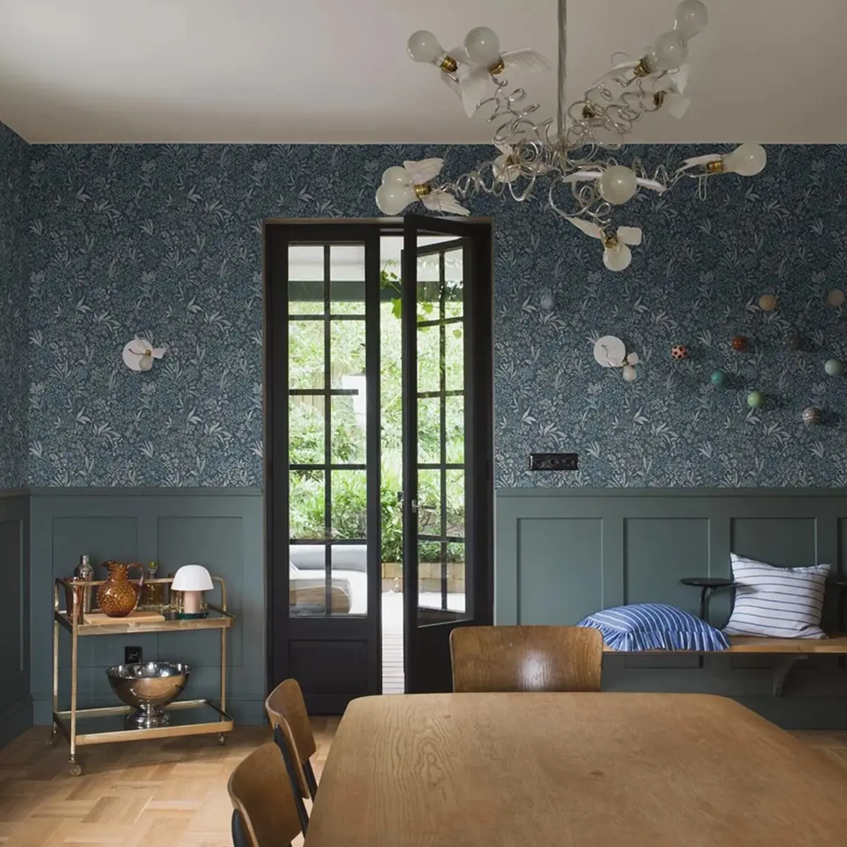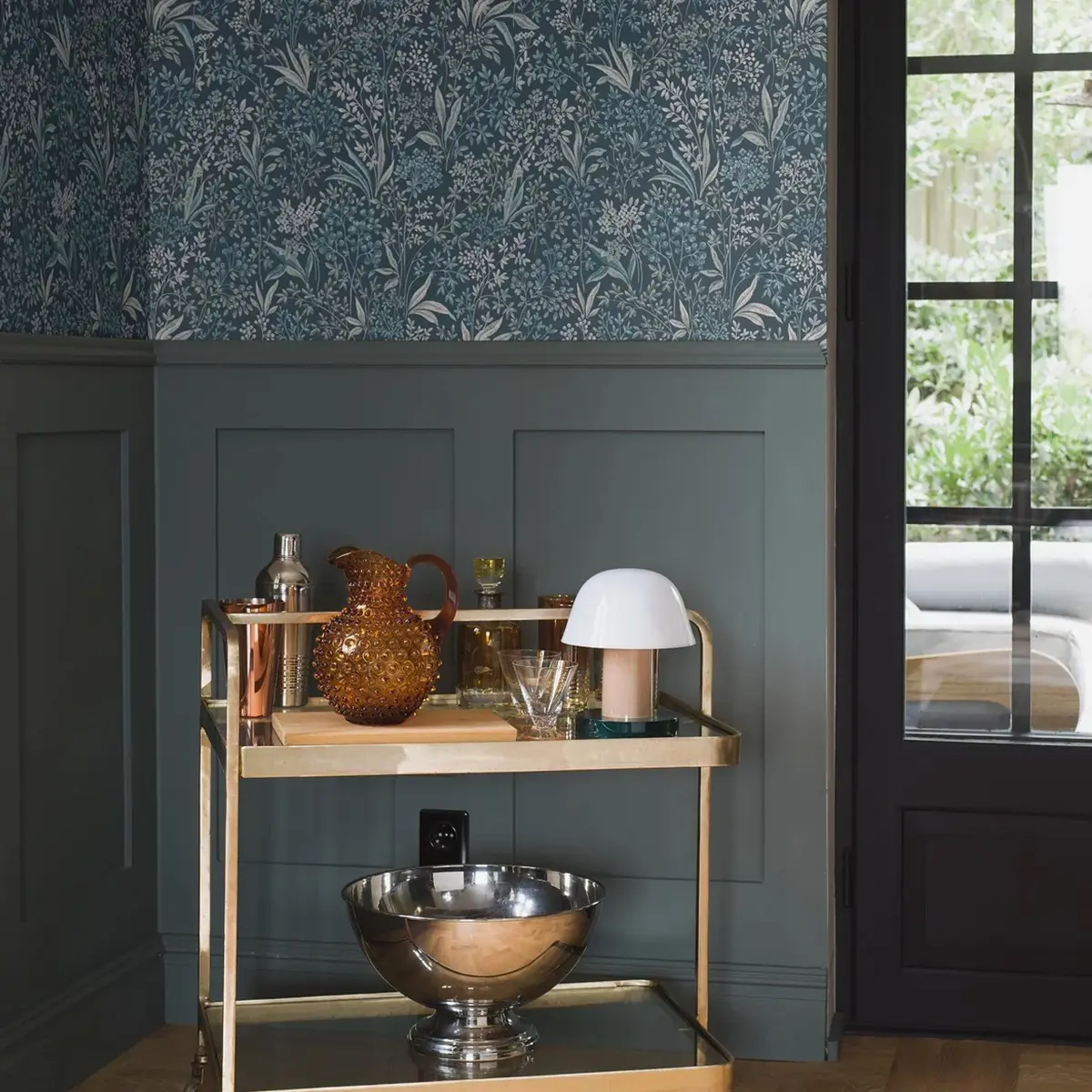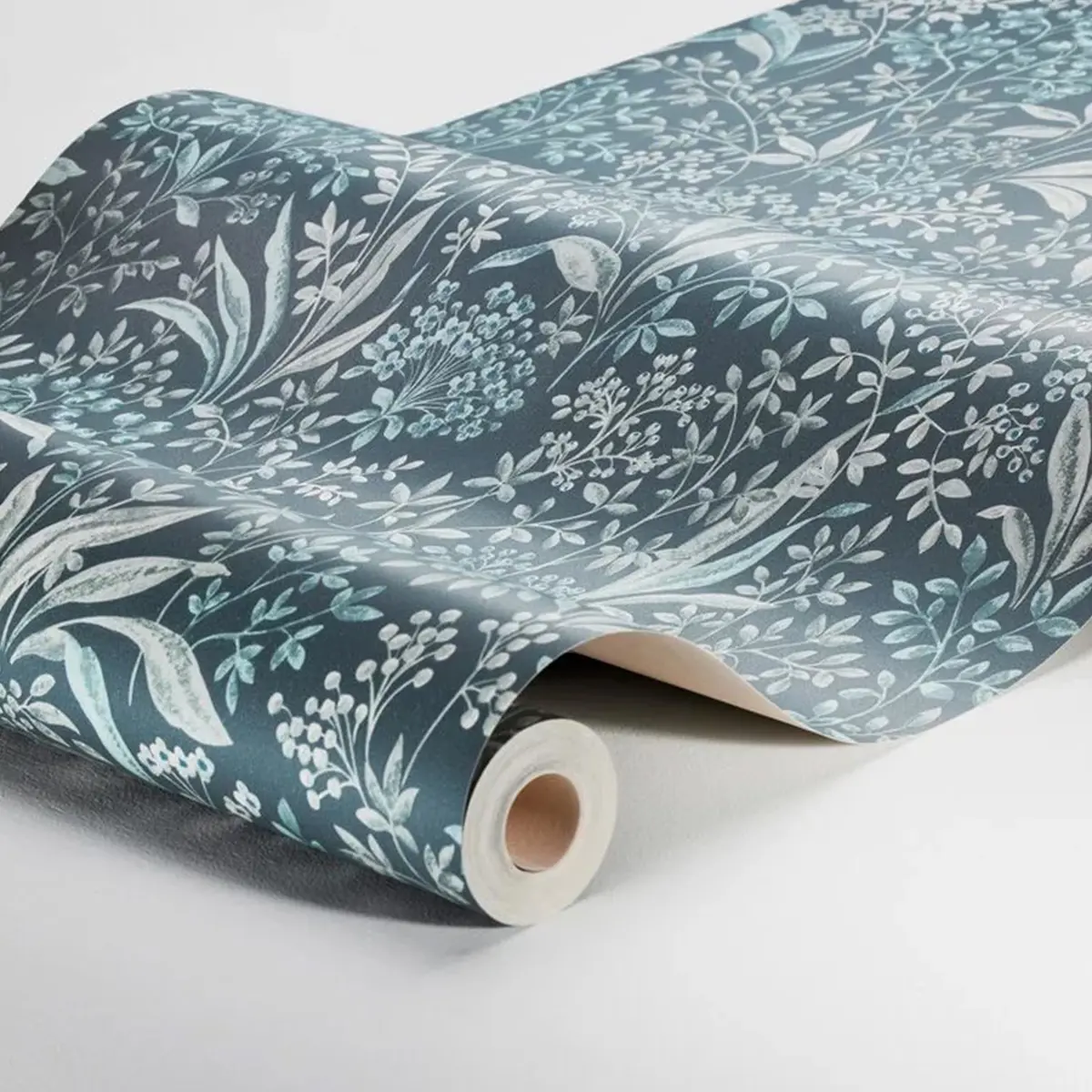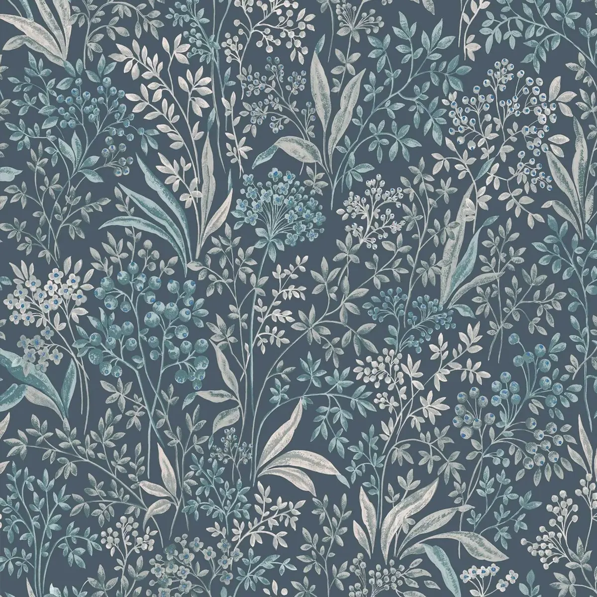 Boråstapeter Vårt Arkiv Nocturne 2025 är en blå tapet med blommor och blad från sommarängen i dova nyanser av grön och blå.
