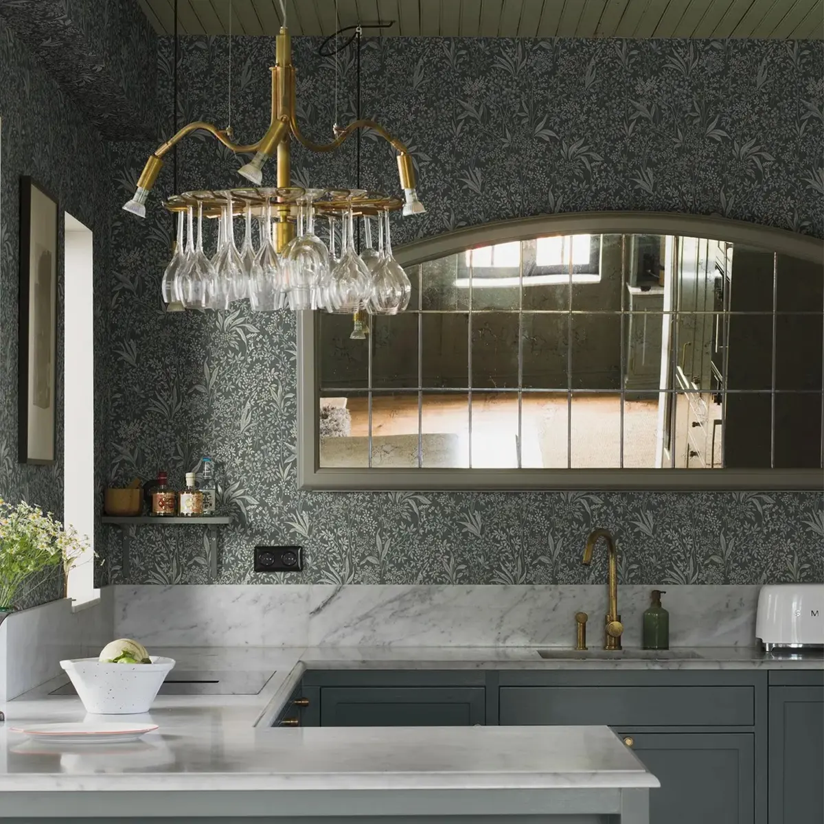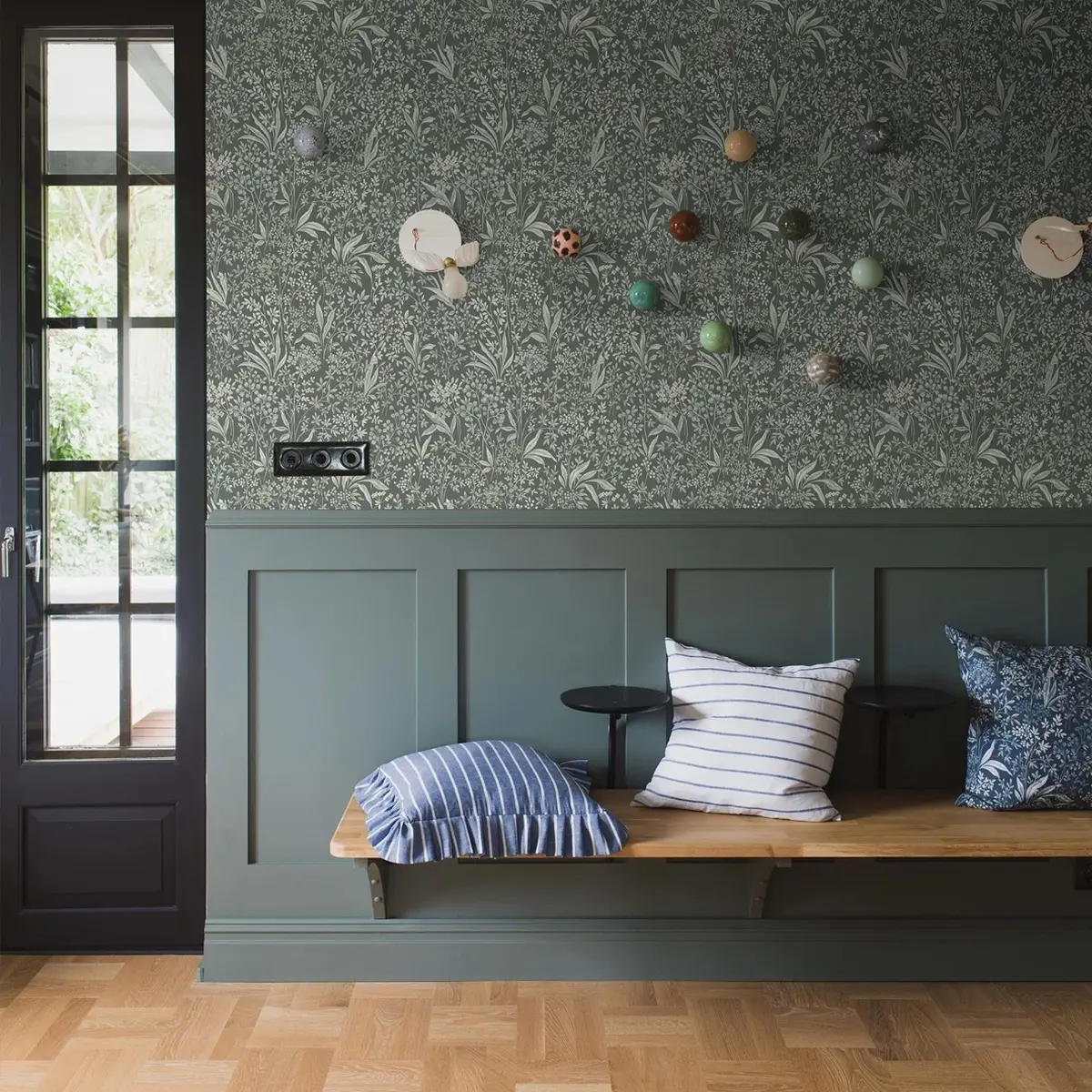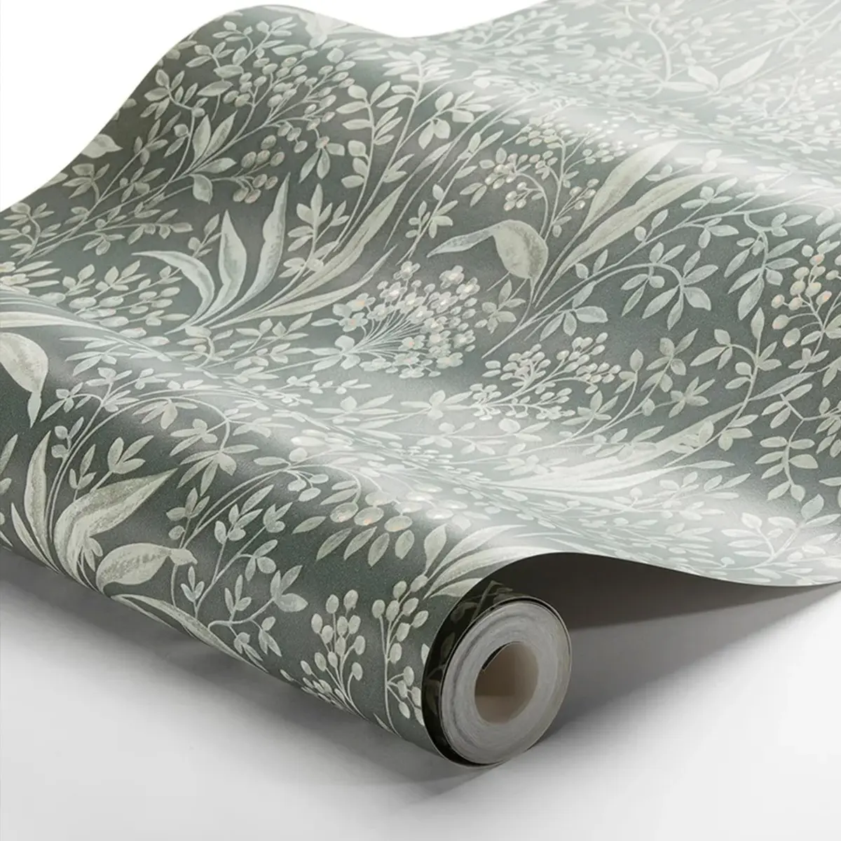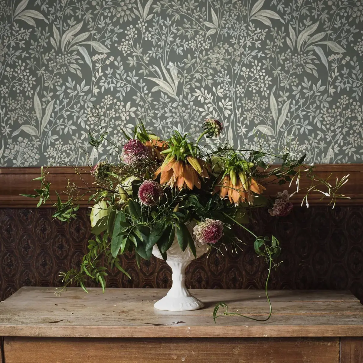 Emilys gröna Nocturne är en av tre helt nya färgställningar av vårt mest älskade tapetmönster. Originalet med sina handmålade blommor, bär och blad är hämtat från vårt stora tapetarkiv och varsamt uppdaterat. Tidlös charm i trendiga kulörer, nu också med guldskimrande inslag! Emilys Nocturne går från dovt mörkgrönt till ljusare oliv- och lindblomsgrönt med små detaljer i guld. Som en skimrande, skuggig dunge en sen sommarkväll.