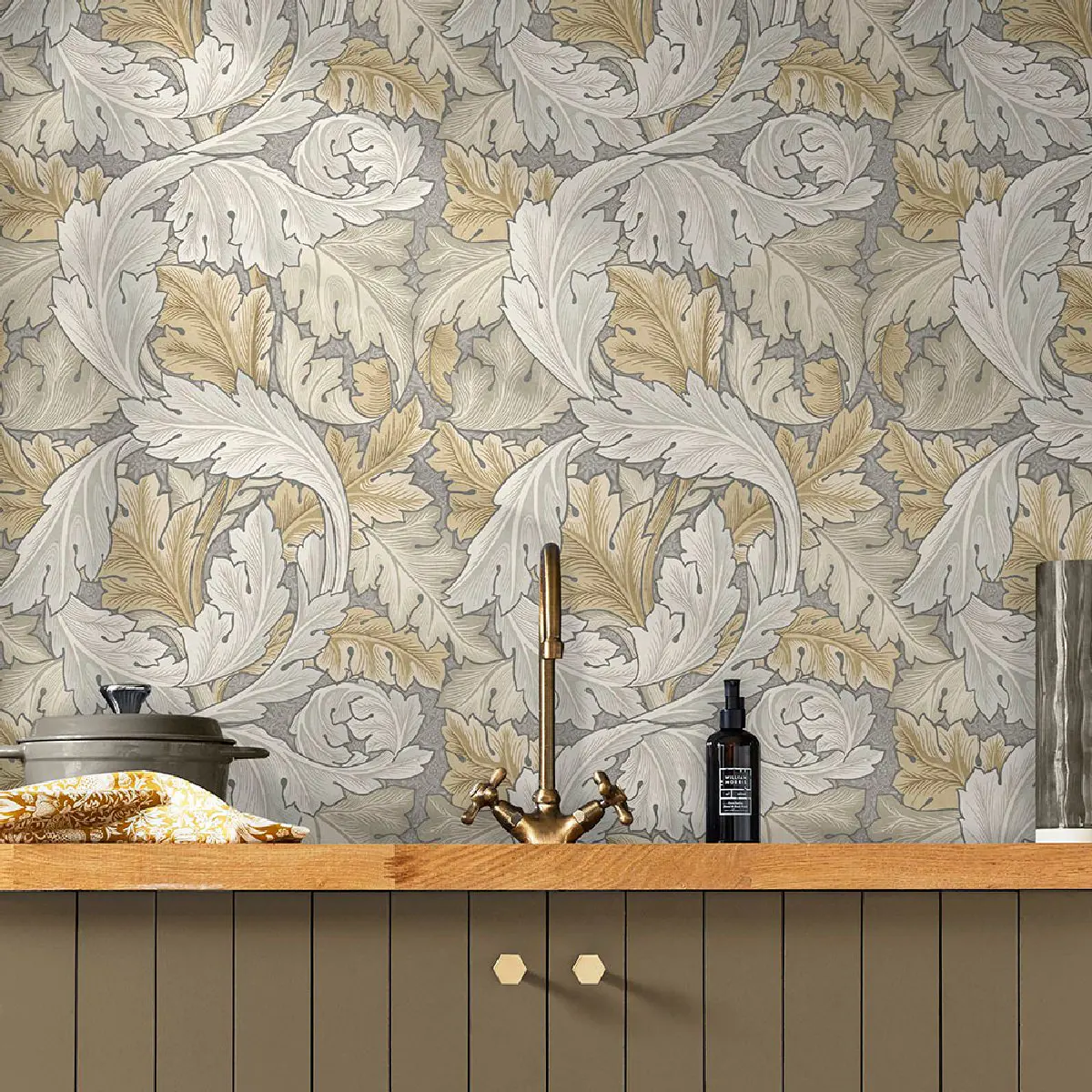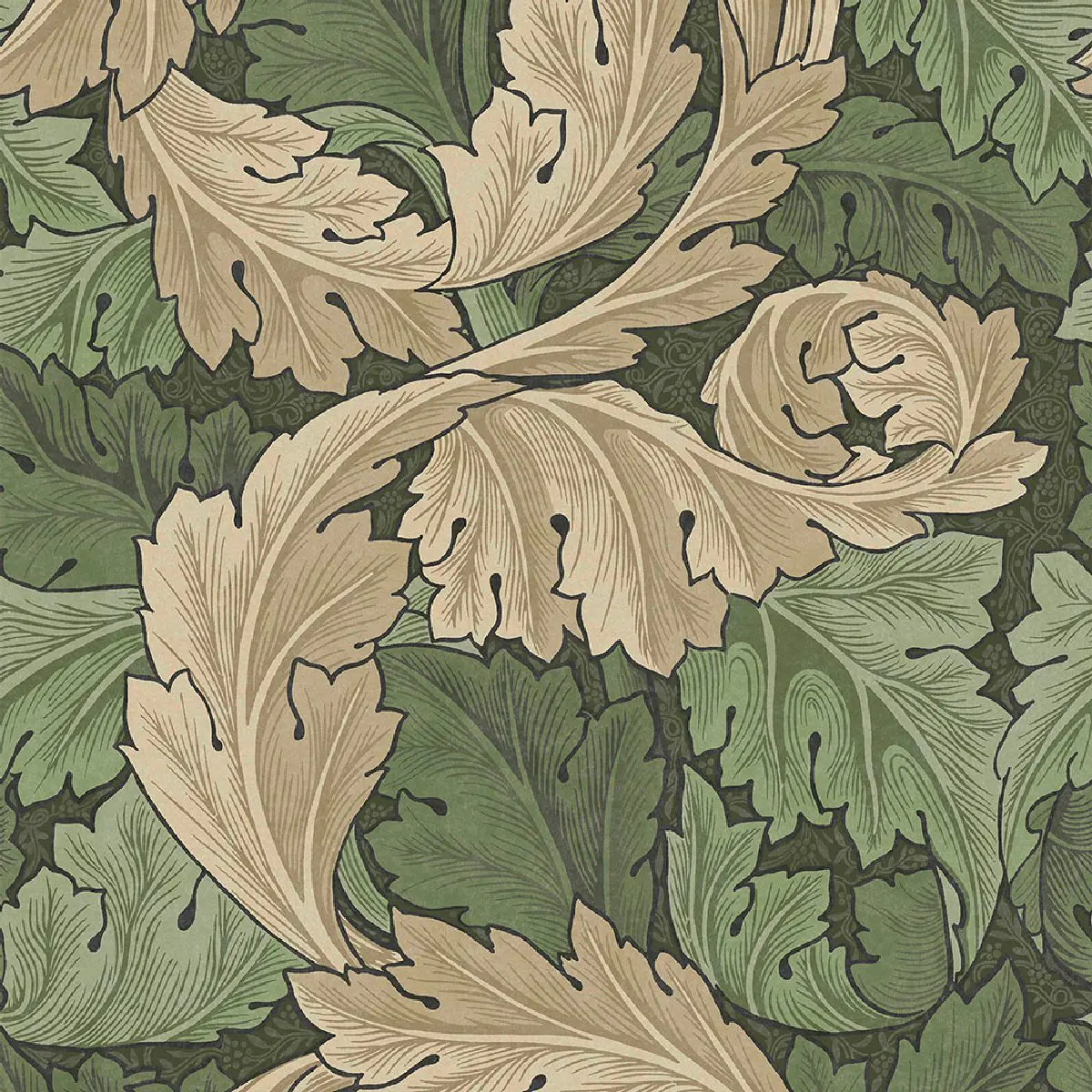 Acanthusblad pryder många av Morris tapeter och är en central del i hans tapetmönster "Acanthus". Dessa virvlande, böljande blad användes först i antika grekiska verk och har sedan dess dekorerat väggar och byggnader. Morris fann detta klassiska motiv idealiskt för upprepade mönster och ansåg att det stora mönstret han skapade här var perfekt för mindre rum, vilket skapade en mer rofylld atmosfär än ett mindre, tätare mönster.