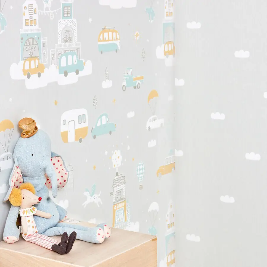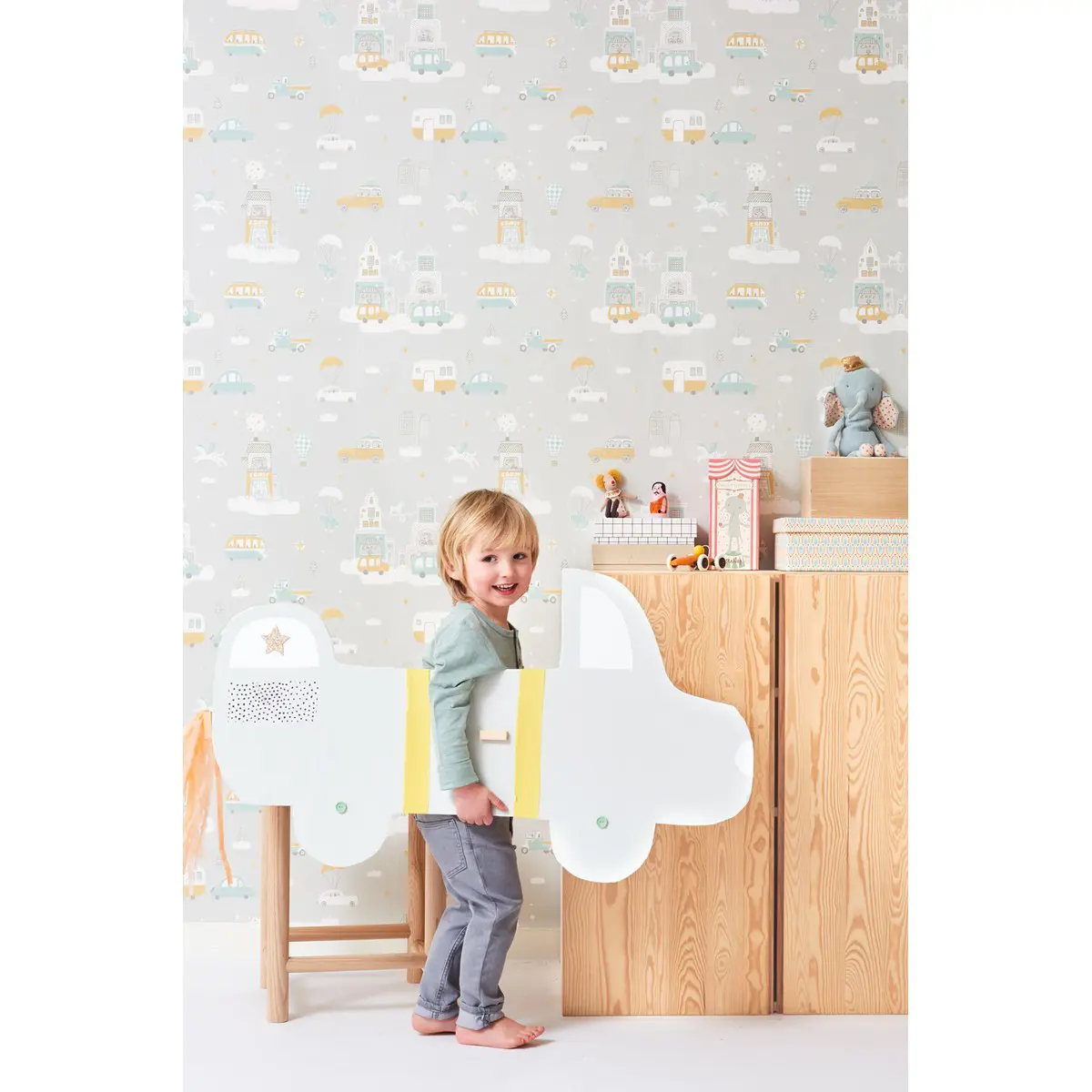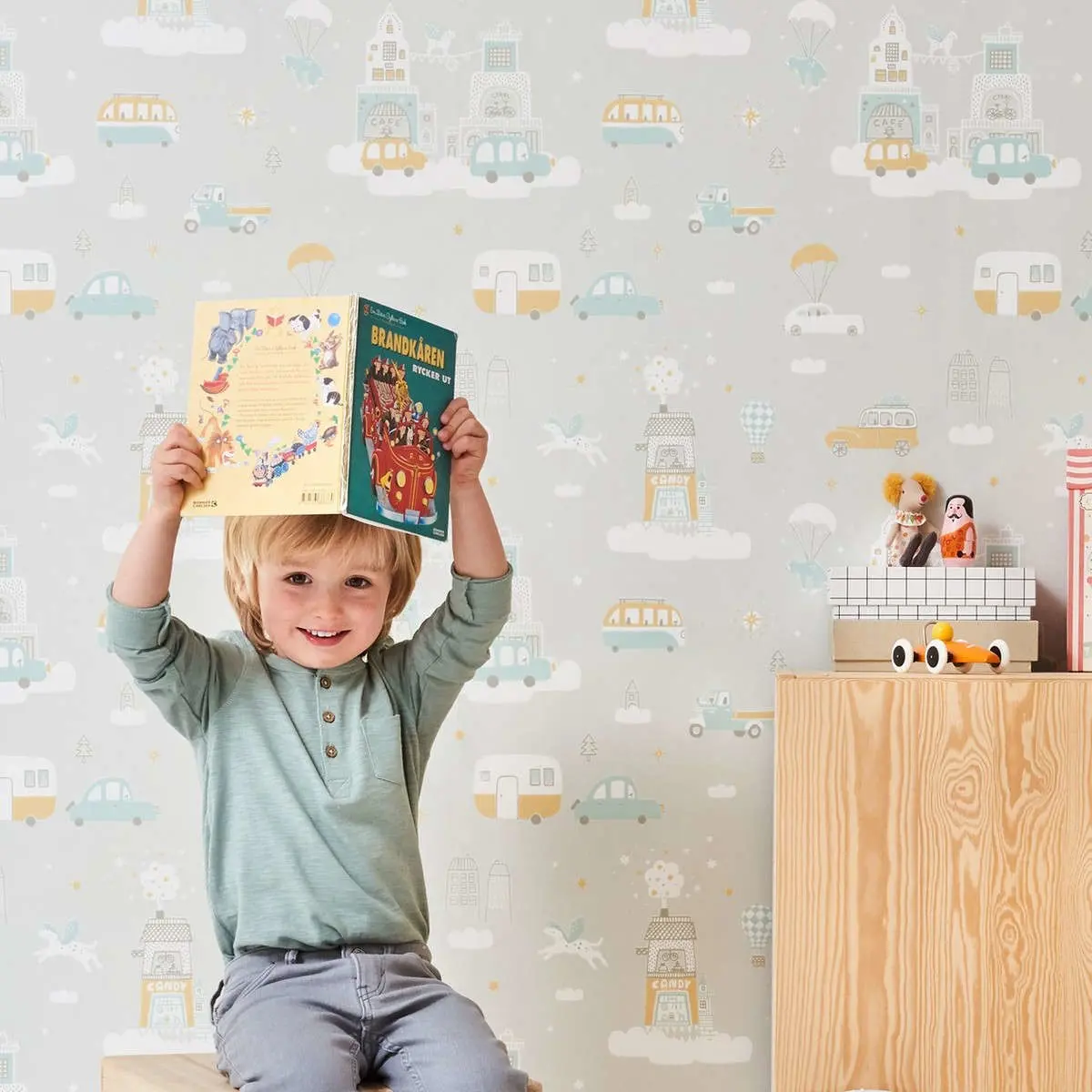 Majvillan Wish Upon Your Dreams Above The Clouds Grey 131-01 är en Easy Up tapet från kollektionen Wish Upon Your Dreams. Tapet är en fordonrik barntapet i Easy Up variant. I denna tapeten finner du en behaglig mjuk grå botten som skapar harmoni i mönstret som är bestående av olika turkosa, vita och gula fordon, så som bilar, husvagnar och mopeder. En tapet som får barnens fantasi att glimta. En magisk drömliknande kollektion som är perfekt för att inspirera funderingar hos både barn och vuxna. Med dansande enhörningar, mytiska drakar och bedårande stora djungelkatter, som alla har vackert ritats med en härlig rolig kärleksfull oskuld. Finns i en rad mjuka pastellfärger som har valts smart för att kunna komplettera varandra perfekt. Tapeten är easy up och rekommenderas att sättas upp med lim avsett för easy up. Det går åt ca 1 liter lim per tapetrulle beroende på underlaget.