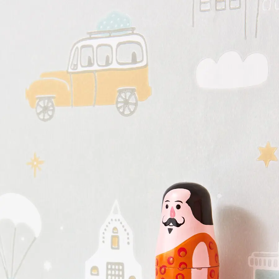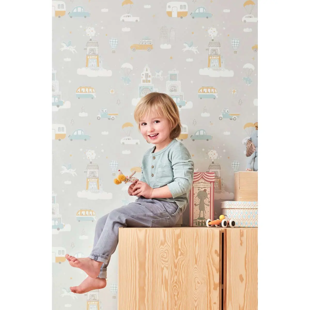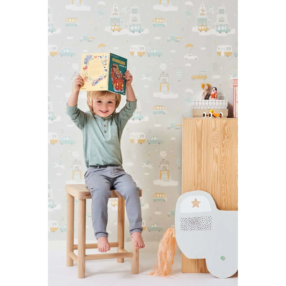 Majvillan Wish Upon Your Dreams Above The Clouds Grey 131-01 är en Easy Up tapet från kollektionen Wish Upon Your Dreams. Tapet är en fordonrik barntapet i Easy Up variant. I denna tapeten finner du en behaglig mjuk grå botten som skapar harmoni i mönstret som är bestående av olika turkosa, vita och gula fordon, så som bilar, husvagnar och mopeder. En tapet som får barnens fantasi att glimta. En magisk drömliknande kollektion som är perfekt för att inspirera funderingar hos både barn och vuxna. Med dansande enhörningar, mytiska drakar och bedårande stora djungelkatter, som alla har vackert ritats med en härlig rolig kärleksfull oskuld. Finns i en rad mjuka pastellfärger som har valts smart för att kunna komplettera varandra perfekt. Tapeten är easy up och rekommenderas att sättas upp med lim avsett för easy up. Det går åt ca 1 liter lim per tapetrulle beroende på underlaget.