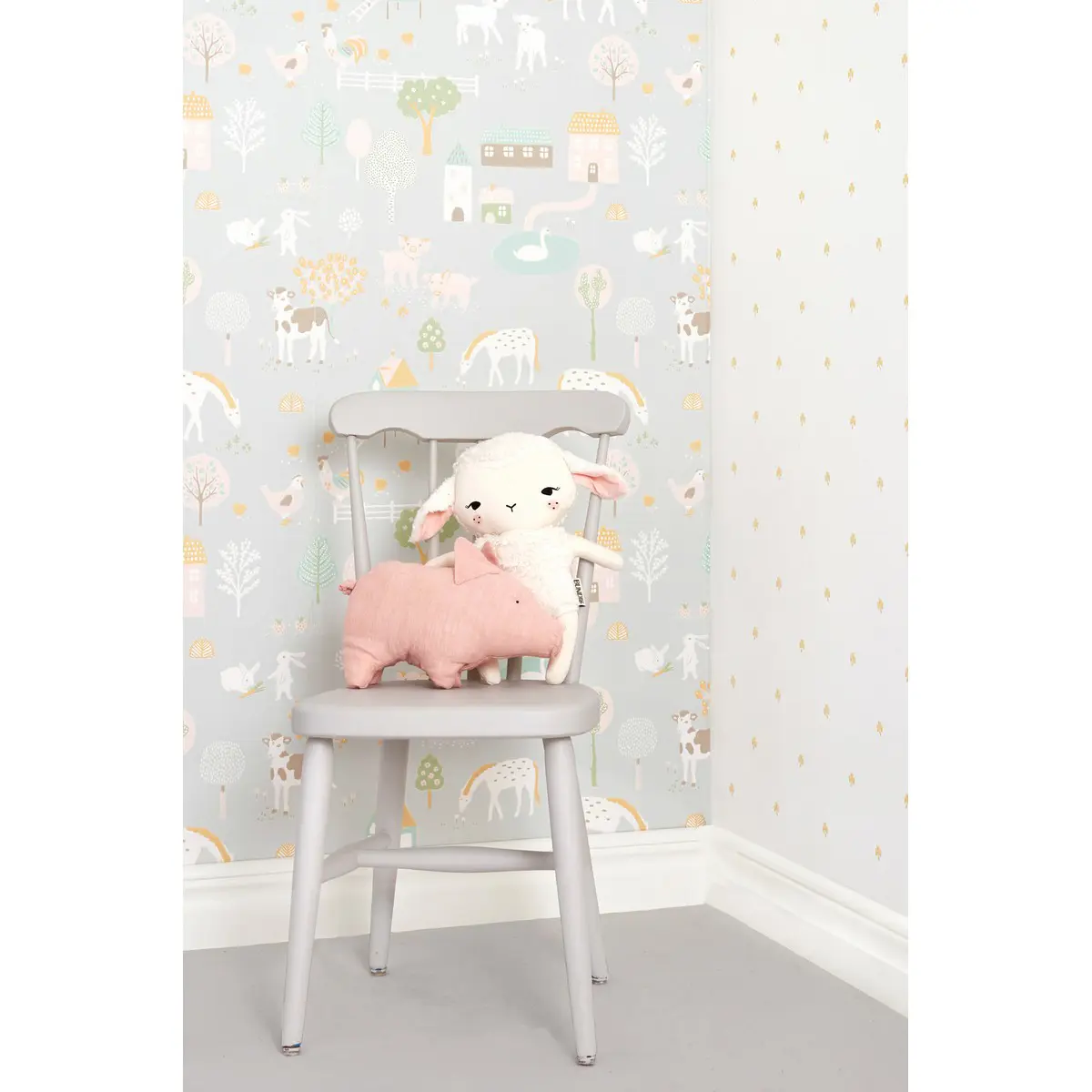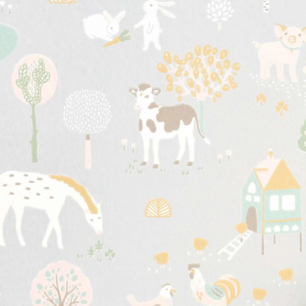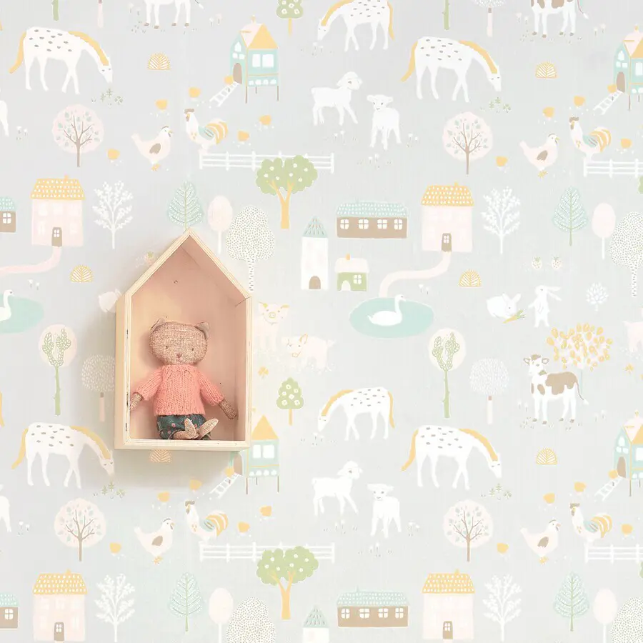Majvillan Wish Upon Your Dreams My Farm Grey 127-01 är en Easy Up tapet från kollektionen Wish Upon Your Dreams. Tapet är en enastående barntapet i Easy Up variant. I denna tapeten finner du en mjuk ljusgrå botten som dekorerats med ett bondgårdstema. Du finner djur som brunvita kor, ljusrosa grisar, vita kaniner, vita hästar och vita höns som vandrar omkring på ett harmoniskt vis bland hönshus, blommor och träd. En magisk drömliknande kollektion som är perfekt för att inspirera funderingar hos både barn och vuxna. Med dansande enhörningar, mytiska drakar och bedårande stora djungelkatter, som alla har vackert ritats med en härlig rolig kärleksfull oskuld. Finns i en rad mjuka pastellfärger som har valts smart för att kunna komplettera varandra perfekt. Tapeten är easy up och rekommenderas att sättas upp med lim avsett för easy up. Det går åt ca 1 liter lim per tapetrulle beroende på underlaget.