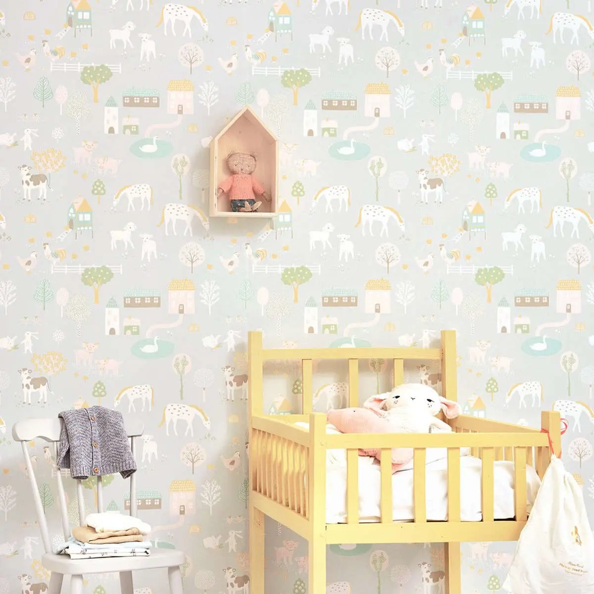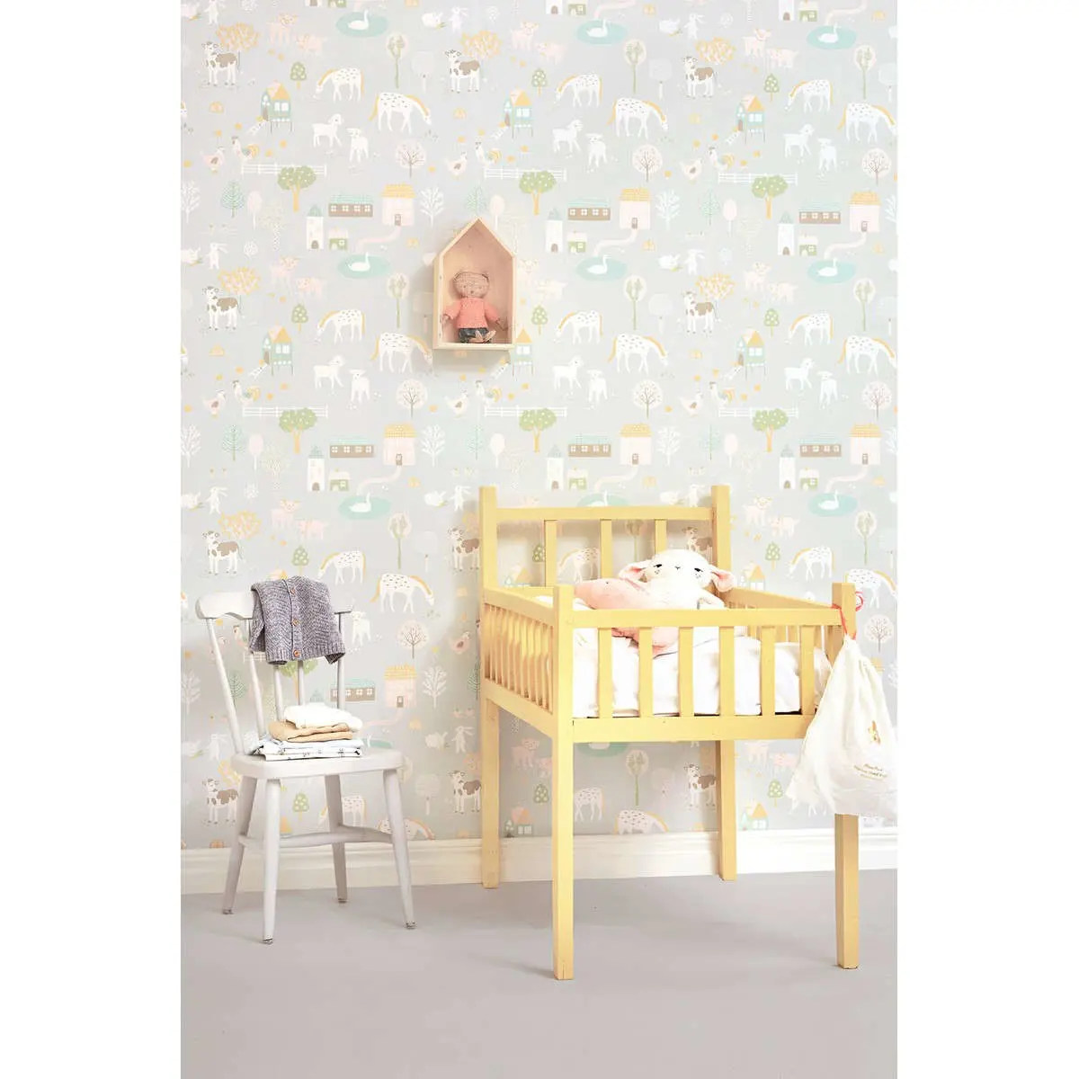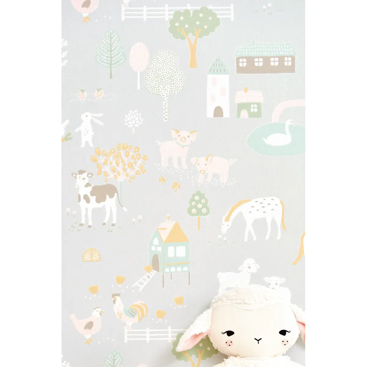Majvillan Wish Upon Your Dreams My Farm Grey 127-01 är en Easy Up tapet från kollektionen Wish Upon Your Dreams. Tapet är en enastående barntapet i Easy Up variant. I denna tapeten finner du en mjuk ljusgrå botten som dekorerats med ett bondgårdstema. Du finner djur som brunvita kor, ljusrosa grisar, vita kaniner, vita hästar och vita höns som vandrar omkring på ett harmoniskt vis bland hönshus, blommor och träd. En magisk drömliknande kollektion som är perfekt för att inspirera funderingar hos både barn och vuxna. Med dansande enhörningar, mytiska drakar och bedårande stora djungelkatter, som alla har vackert ritats med en härlig rolig kärleksfull oskuld. Finns i en rad mjuka pastellfärger som har valts smart för att kunna komplettera varandra perfekt. Tapeten är easy up och rekommenderas att sättas upp med lim avsett för easy up. Det går åt ca 1 liter lim per tapetrulle beroende på underlaget.