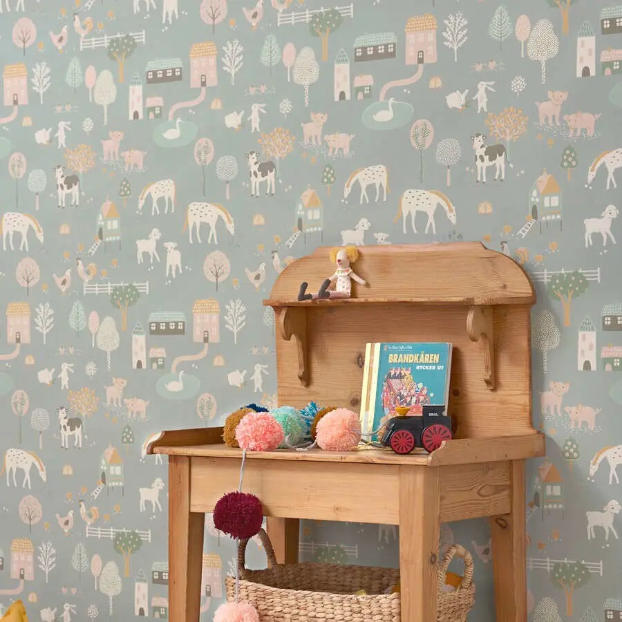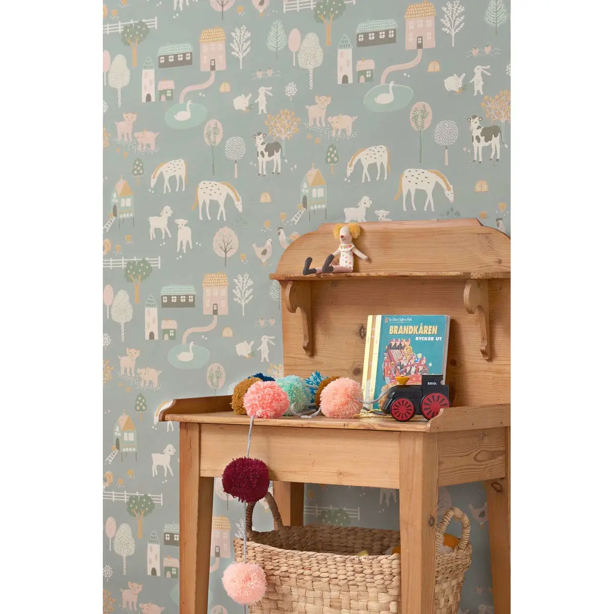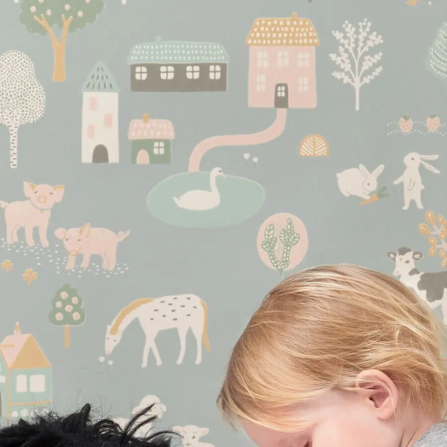 Majvillan Wish Upon Your Dreams My Farm Blue 127-02 är en Easy Up tapet från kollektionen Wish Upon Your Dreams. Tapet är en enastående barntapet i Easy Up variant. I denna tapeten finner du en mjuk mörkturkos botten som dekorerats med ett bondgårdstema. Du finner djur som brunvita kor, vita lamm, vita kaniner, vita hästar och vita höns som vandrar omkring på ett harmoniskt vis bland gårdens hus och stall. En magisk drömliknande kollektion som är perfekt för att inspirera funderingar hos både barn och vuxna. Med dansande enhörningar, mytiska drakar och bedårande stora djungelkatter, som alla har vackert ritats med en härlig rolig kärleksfull oskuld. Finns i en rad mjuka pastellfärger som har valts smart för att kunna komplettera varandra perfekt. Tapeten är easy up och rekommenderas att sättas upp med lim avsett för easy up. Det går åt ca 1 liter lim per tapetrulle beroende på underlaget.