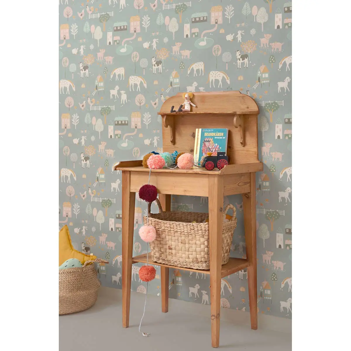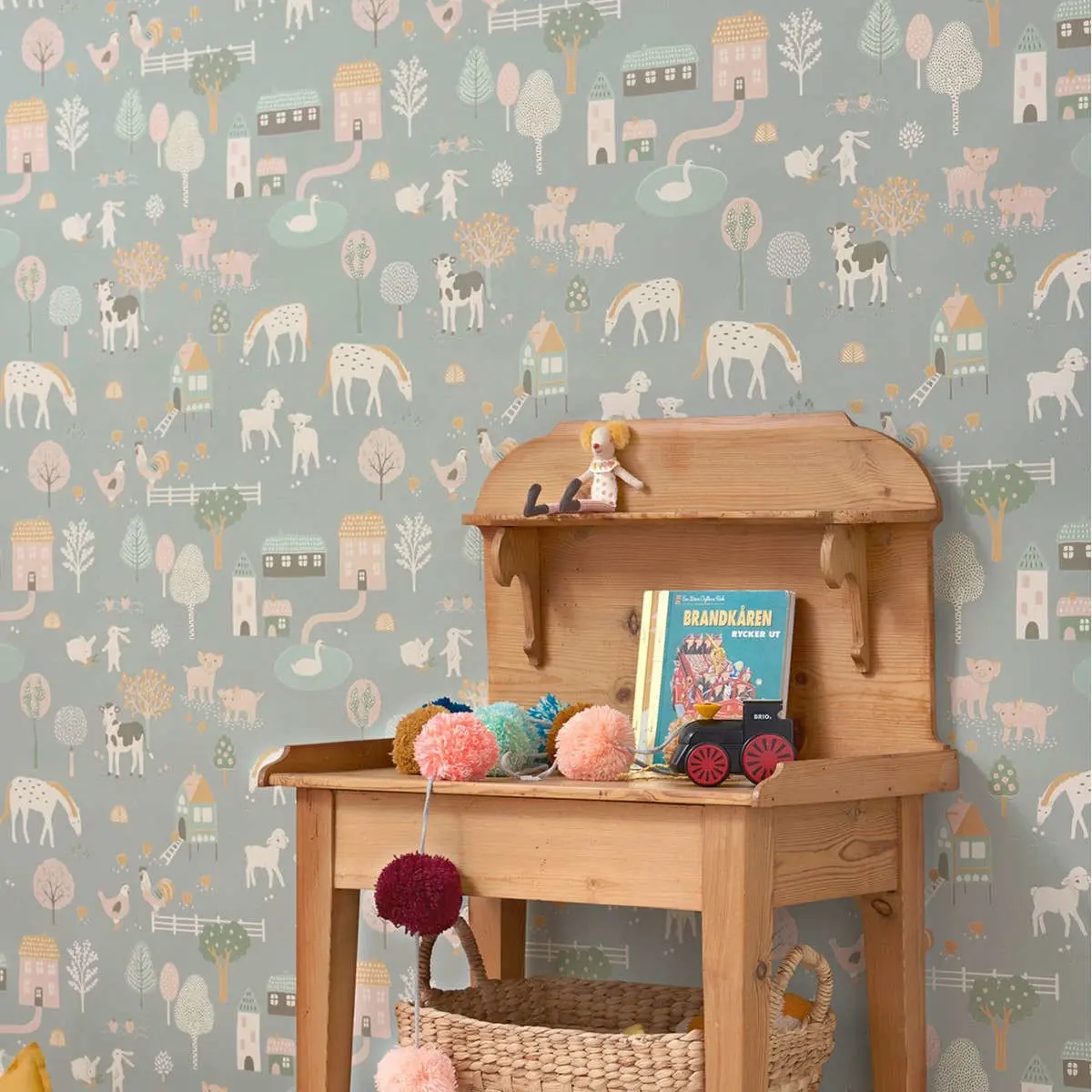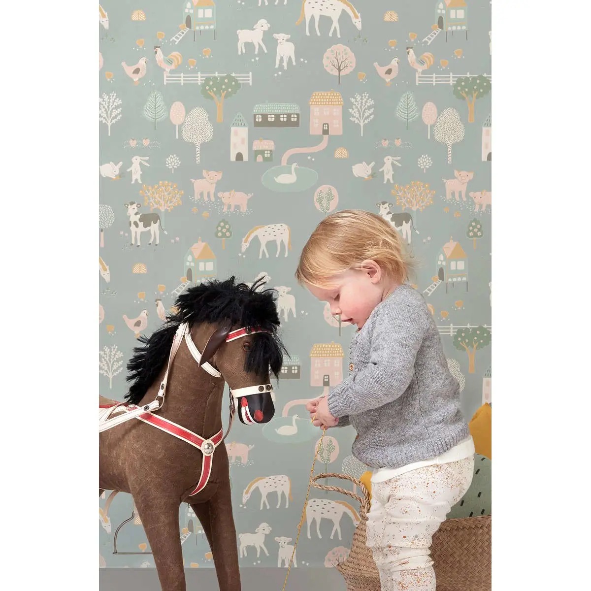 Majvillan Wish Upon Your Dreams My Farm Blue 127-02 är en Easy Up tapet från kollektionen Wish Upon Your Dreams. Tapet är en enastående barntapet i Easy Up variant. I denna tapeten finner du en mjuk mörkturkos botten som dekorerats med ett bondgårdstema. Du finner djur som brunvita kor, vita lamm, vita kaniner, vita hästar och vita höns som vandrar omkring på ett harmoniskt vis bland gårdens hus och stall. En magisk drömliknande kollektion som är perfekt för att inspirera funderingar hos både barn och vuxna. Med dansande enhörningar, mytiska drakar och bedårande stora djungelkatter, som alla har vackert ritats med en härlig rolig kärleksfull oskuld. Finns i en rad mjuka pastellfärger som har valts smart för att kunna komplettera varandra perfekt. Tapeten är easy up och rekommenderas att sättas upp med lim avsett för easy up. Det går åt ca 1 liter lim per tapetrulle beroende på underlaget.