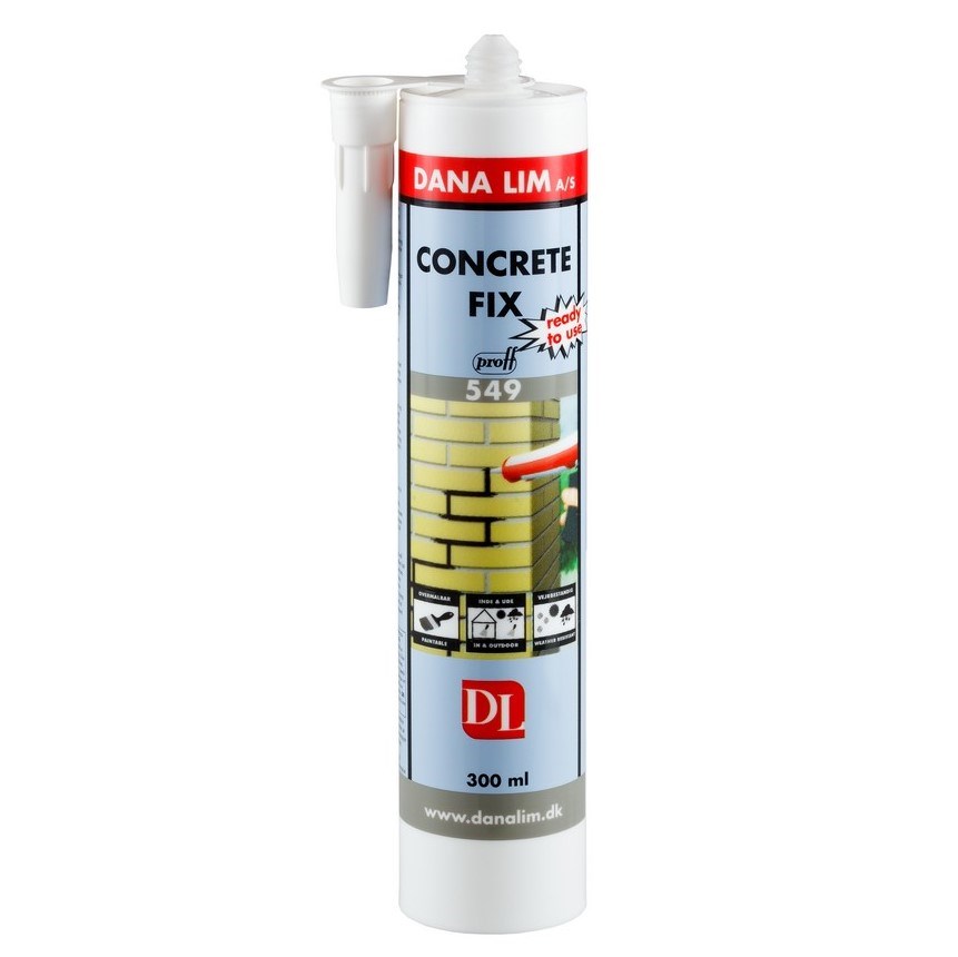 Concrete Fix 549 är ett vattenbaserat reparationsbruk på patron som används till reparation av hål, sprickor och bortfall i murfog och puts, såväl ute som inne.Concrete Fix 549 fäster på de flesta material som tegel, betong och cement. Är efter torkning både väder- och vattenbeständig.Kan både slipas och målas.Concrete Fix 549 är en färdigblandad murfog som är lätt att applicera, även i mindre hål med hjälp av fogpistol.Produkten är inte lämplig för rörelsefogar.