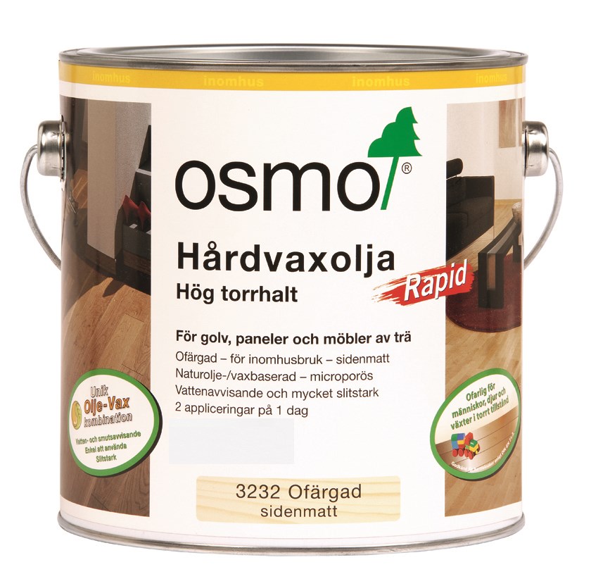 Osmo Hårdvaxolja Rapid Snabbtorkande version av Osmo Hårdvaxolja Originalet, hälften så lång torktid. Perfekt för trägolv och ger en vacker yta som bevarar träets naturliga karaktär. Ytan blir vatten- och smutsavvisande, mycket slitstark och tålig mot spill. Tålig mot spill Osmo Hårdvaxolja Rapid är idealisk för trägolv och ger en vacker yta som bevarar träets naturliga karaktär. Ytan blir vatten- och smutsavvisande, mycket slitstark och tålig mot spill. Passar perfekt för golv av massivt trä, lamellparkett, OSB eller kork men passar även för möbler, paneler och limträ med mera. Finns ofärgad matt eller sidenmatt och vit.