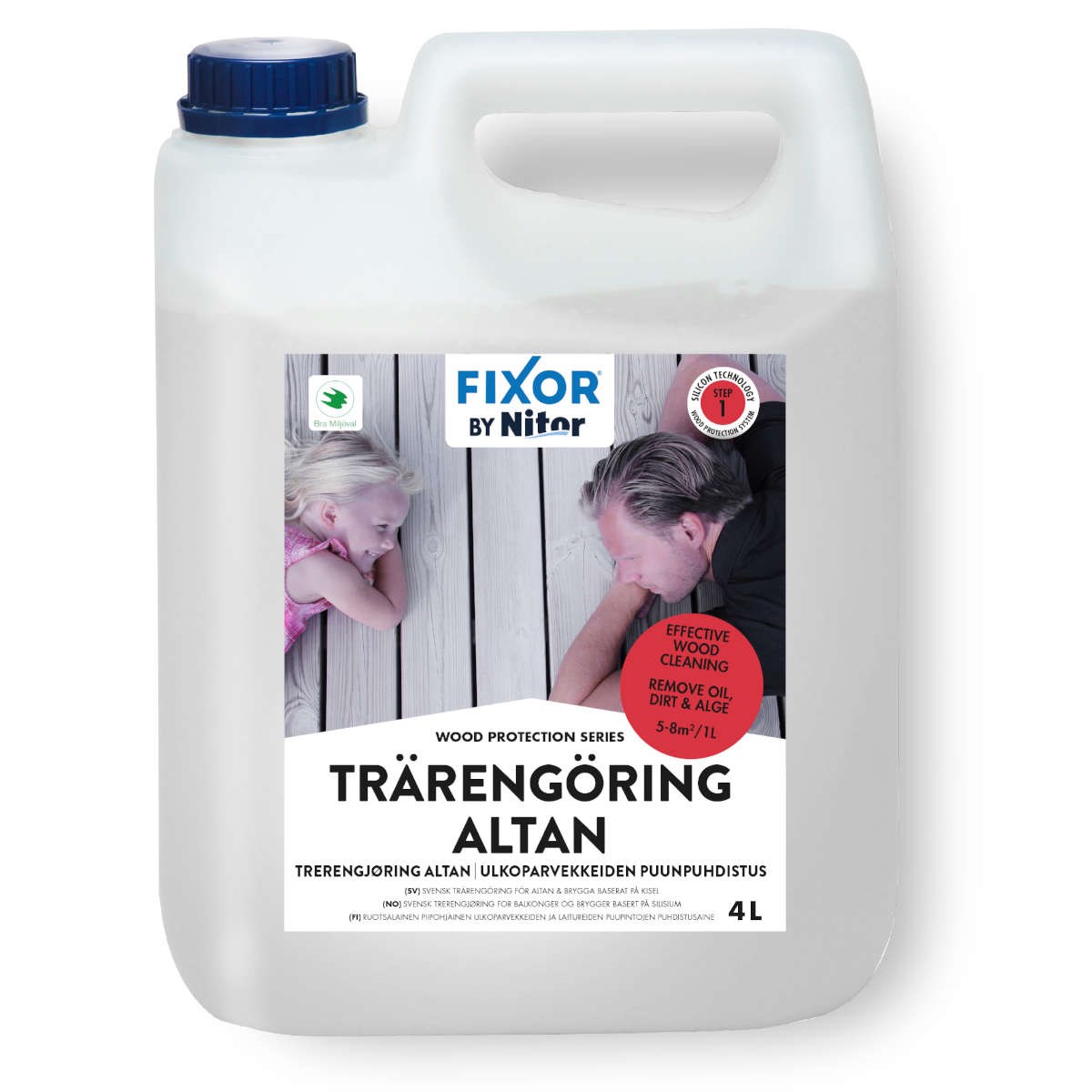 Trärengöring Altan har tre goda egenskaper: rengör, förimpregnerar träytan, och öppnar upp träfibrerna så att nästa steg i behandlingen
