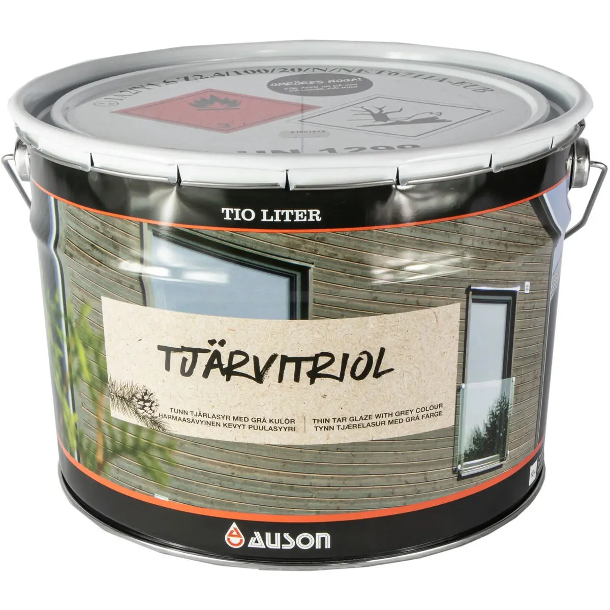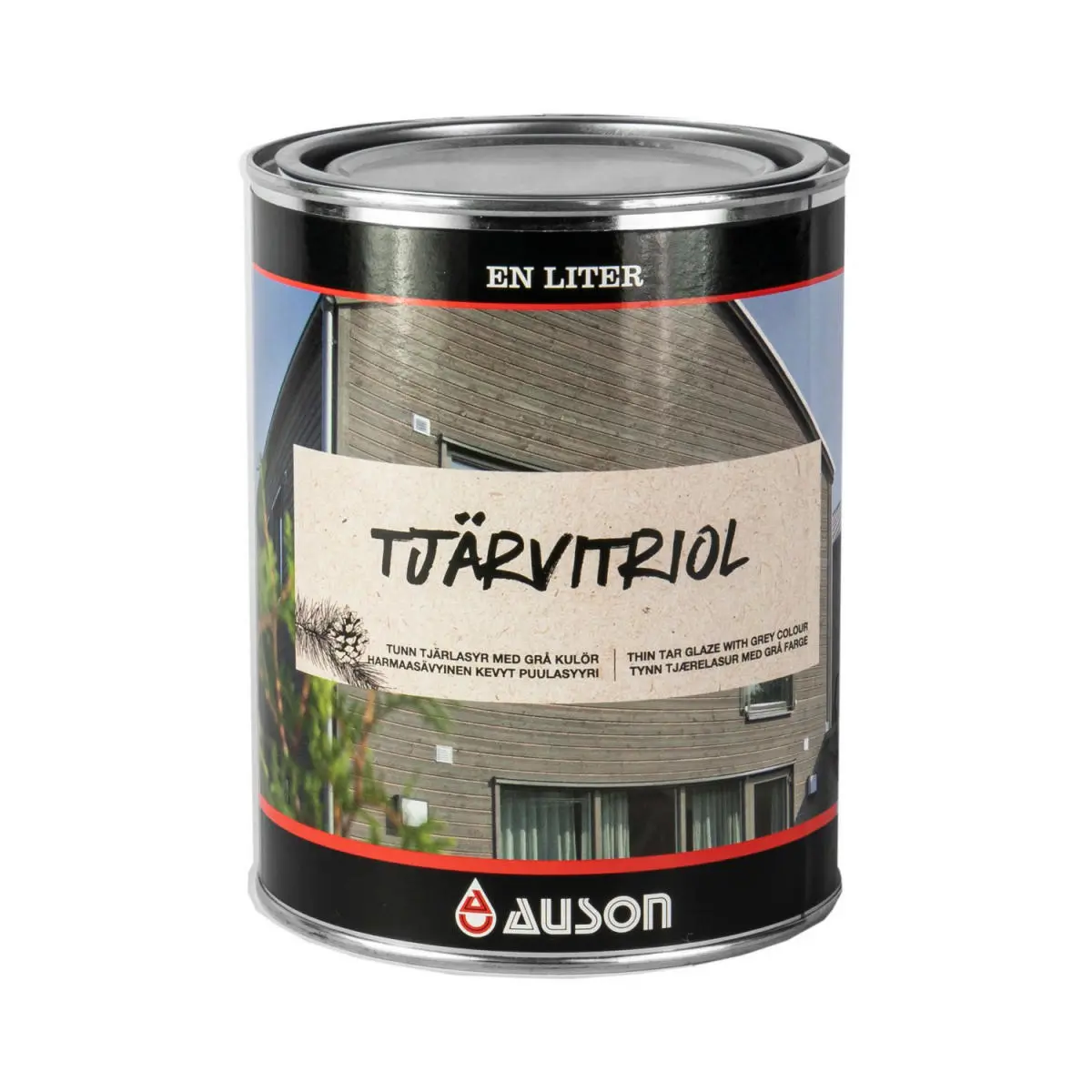 Auson Tjärvitriol 3 L är en tunn tjärlasyr som ger en stilren, modernt grå kulör. Den varmgråa kulören framträder efterhand som tjärans naturligt bruna kulör tonas ner. Slutresultatet blir en stilren grå kulör som smälter in i naturen och vårdar träet. Tjärvitriol innehåller terpentin och kan användas på obehandlat trä och på trä som tidigare har behandlats med tjära eller järnvitriol.Rör noggrant om i burken innan du målar, eftersom pigmentet lätt lägger sig i botten vid lagring. Rör även om regelbundet medan du målar. Detta är speciellt viktigt för Tjärvitriol som är tunnare än de övriga tjärfärgerna och därför behöver omrörning i burken mycket oftare. Annars hamnar pigmentet i botten och du får en ojämn kulör på fasaden.